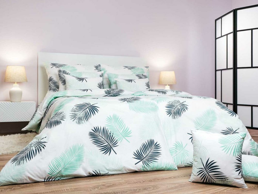 Hřejivé flanelové ložní prádlo Peříčka mentolová s moderním motivem jemných listů v mentolových a šedých tónech na bílém podkladu přináší do ložnice pohodlí a útulnost. Skvěle se hodí k prostěradlům v barvě bílé, mentolové nebo tmavě šedé. Vyrobeno v České republice firmou DADKA VRACOV.
