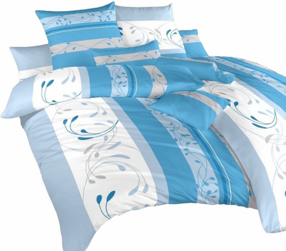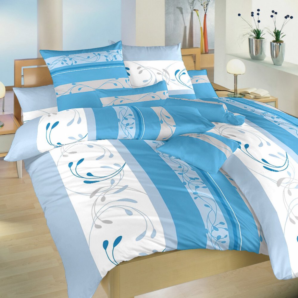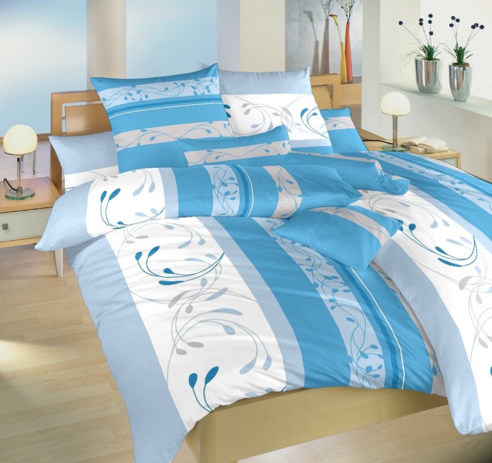 Povlečení laděno v barvě modré a bílé.