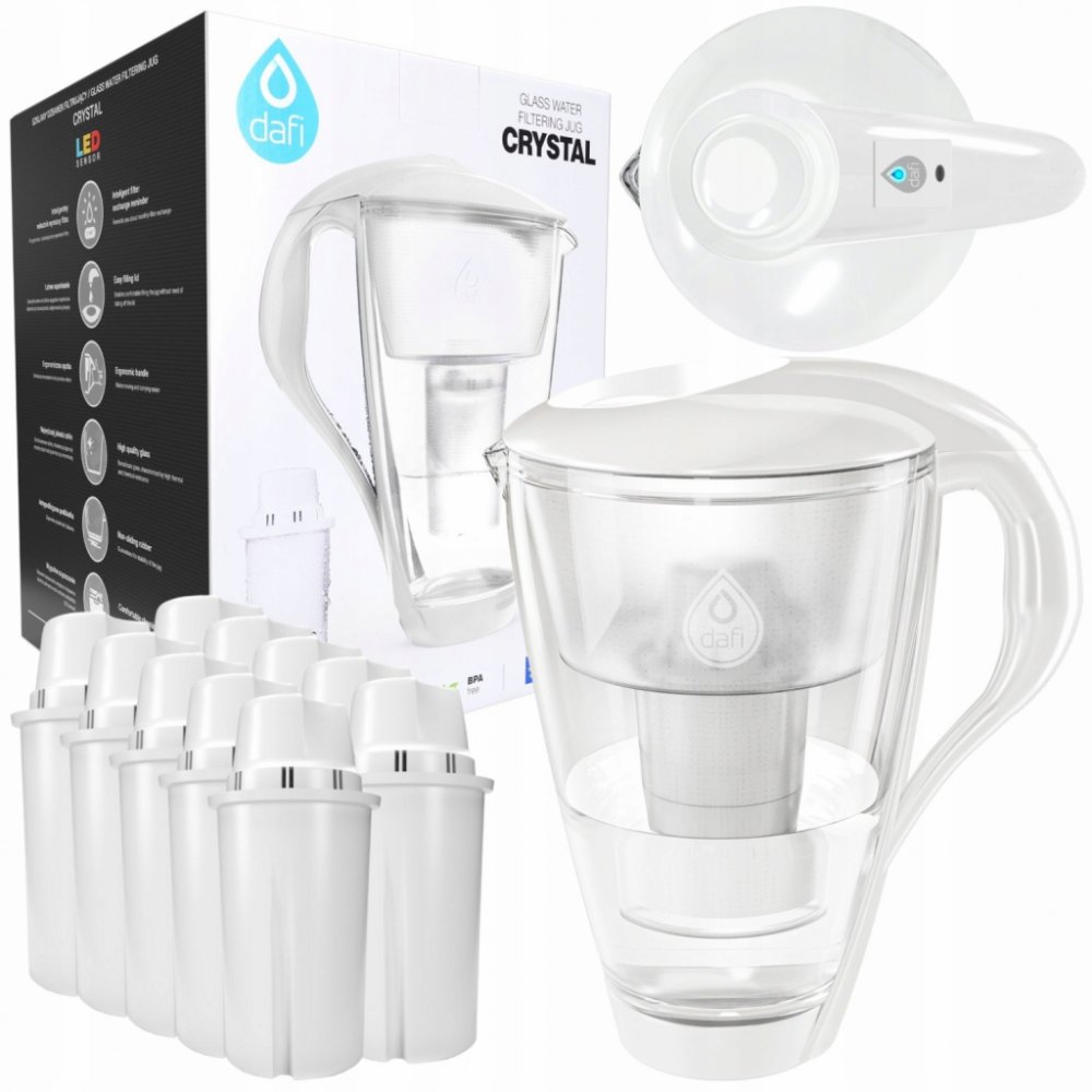 Dafi Crystal LED skleněná filtrační konvice bílá + 1 filtr Dafi Classic Luxusní skleněná filtrační konvice Dafi Crystal Classic v bílé barvě s celkovým objemem 2,0 litry, kapacitou přefiltrované vody o objemu 1,0 litru a LED senzorem zbavuje vodu od chloru, těžkých kovů a škodlivých látek, které se mohou vyskytnout ve vodě z vodovodního řádu. Dále eliminuje přebytek sloučeniny způsobující tvorbu v...