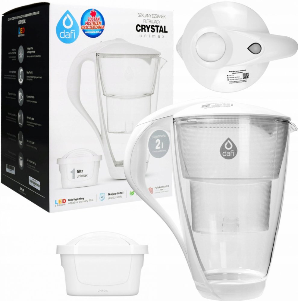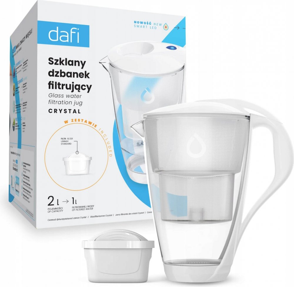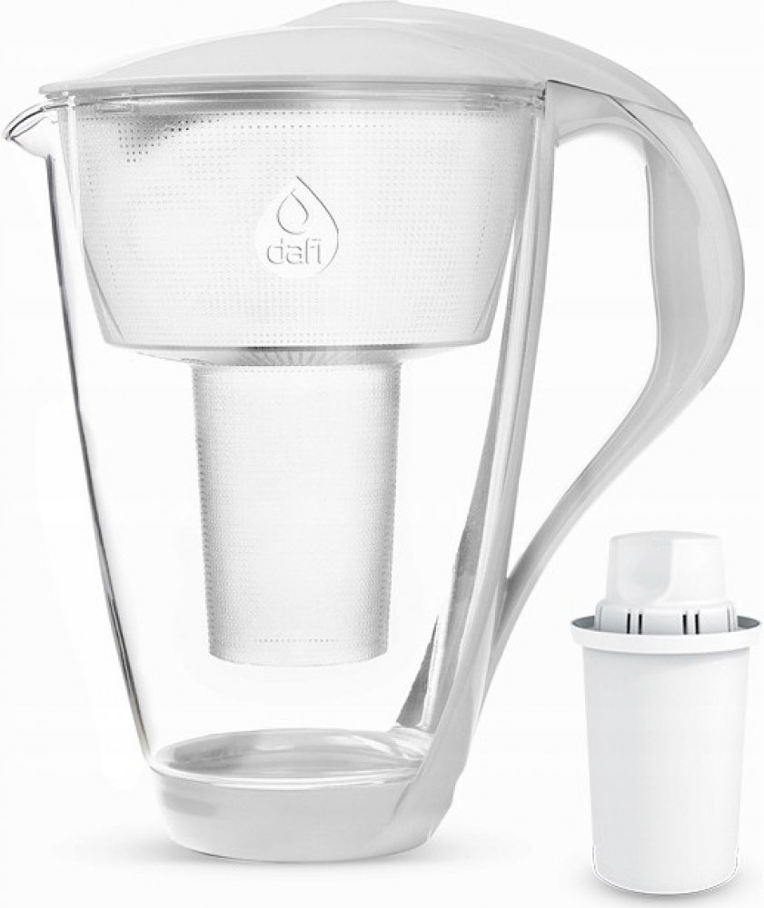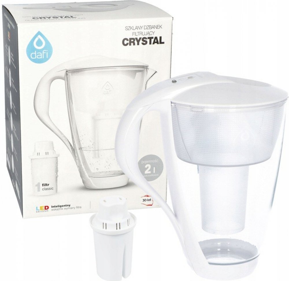 Dafi Crystal LED skleněná filtrační konvice bílá + 1 filtr Dafi Classic Luxusní skleněná filtrační konvice Dafi Crystal Classic v bílé barvě s celkovým objemem 2,0 litry, kapacitou přefiltrované vody o objemu 1,0 litru a LED senzorem zbavuje vodu od chloru, těžkých kovů a škodlivých látek, které se mohou vyskytnout ve vodě z vodovodního řádu. Dále eliminuje přebytek sloučeniny způsobující tvorbu vodního kamene v domácích spotřebičích. Jednoduchý a komfortní design umožňuje napouštění vody do skleněné konvice bez odklopení víčka pouze jednou rukou. Filtrační konvice rychlá a jednoduchá cesta k čisté voděFiltrační konvice představují nejjednodušší a nejrychlejší způsob, jak mít doma čistou vodu. Umožňují během několika okamžiků vyčistit vodu z kohoutku, zlepšit její chuť a podporovat pravidelnou hydrataci organismu. Nákup filtrační konvice a kompatibilních filtrů je malý náklad ve srovnání s částkami, které utratíme za vodu v plastových lahvích, což vede k dlouhodobým úsporám.Skleněná filtrační konvice Dafi CrystalDafi Crystal je ekologická skleněná filtrační konvice. Dokončovací prvky, jako je rukojeť a kryt, jsou vyrobeny z kvalitních bílých plastů a silikonové dno chrání před překlopením a rozbitím. Konvice je navíc vybavena praktickým indikátorem spotřeby filtru Dafi LED, který signalizuje nutnost výměny kartuše změnou barvy.Konvice může s úspěchem sloužit i jako stylová karafa, která je vyrobena z vysoce kvalitního skla.Proces filtrace pomocí filtrační konviceKohoutkovou vodu je třeba nalít do konvice otvorem ve víku -> poté se voda přes filtr čistí. Po přefiltrování se voda dostává do hlavní nádobky, odkud ji lze snadno přelít do sklenice nebo karafy. Celková kapacita filtrační konvice jsou 2 litry. Kompatibilní filtry Dafi ClassicFiltry Dafi Classic jsou kompatibilní s nabízenou filtrační konvicí Dafi Crystal. Směs aktivního uhlí a iontoměničové pryskyřice umožňuje odstranit z vody těžké kovy, chlór a další sloučeniny. Navíc vodu změkčuje, což chrání domácí spotřebiče před usazováním vodního kamene. Výměna filtru je doporučena po uplynutí 30 dní nebo po vyčištění 100-150 litrů vody, podle toho, co nastane dříve.Další výhody filtraceDomácí filtrace není jen o úspoře peněz a pohodlí, ale také o ochraně životního prostředí. Snížením nákupu vody v plastových lahvích snižujeme množství odpadu a škodlivého materiálu, který končí na skládkách. Změňme své návyky a pečujme o planetu s Dafi!Technické údaje Kompatibilní patrony: Dafi Classic filtry | FilterLogic FL-601T. Indikátor výměny filtru prostřednictvím LED senzoru. Víčko pro nalévání vody funguje jako zpětná klapka.Součástí balení je filtrační konvice + 1 ks filtrační patrony Dafi Classic.Filtrační konvice Dafi Crystal Classic je k dostání také v balení s 2 kusy, 4 kusy či 6 kusy filtračních patron Dafi Classic.