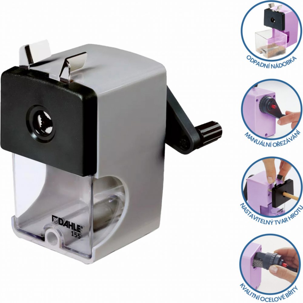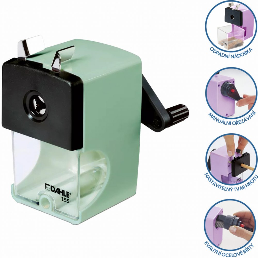 Mechanické ořezávátko s kvalitními ocelovými noži a nastavitelným tvarem hrotu. Snadná a rychlá výměna frézovací jednotky, velkokapacitní průhledná odpadní nádoba. Pevná svorka pro stabilní upevnění ořezávátka ke stolu. Moderní vzhled, svěží barvy.