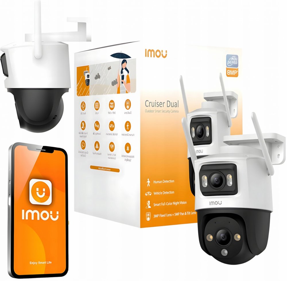 Wi-Fi PTZ IP duální kamera přináší živý monitoring v kvalitě 3+3 Mpx, tím nabízí výhled na větší část prostranství a efektivně redukuje slepá místa. Komprese H.265 snižuje nároky na přenos dat a úložiště. Pro nahrávání zřetelného videa i v naprosté tmě disponuje kamera nočním režimem s IR přisvícením do vzdálenosti až 30 m. Praktická technologie detekce pohybu osob spolu s vestavěnou sirénou spolehlivě ochrání vaši domácnost a odradí nežádoucí návštěvy. O narušení prostoru se ihned dozvíte skrze notifikaci, kterou kamera zašle do vašeho mobilního telefonu prostřednictvím aplikace Imou Life. Ta mimo jiné umožňuje pohodlnou vzdálenou správu, ovládaní kamery, živý náhled či přehrávání záznamu. Díky voděodolnému krytu dle IP66 nabízí kamera jak vnitřní, tak i venkovní možnost použití.