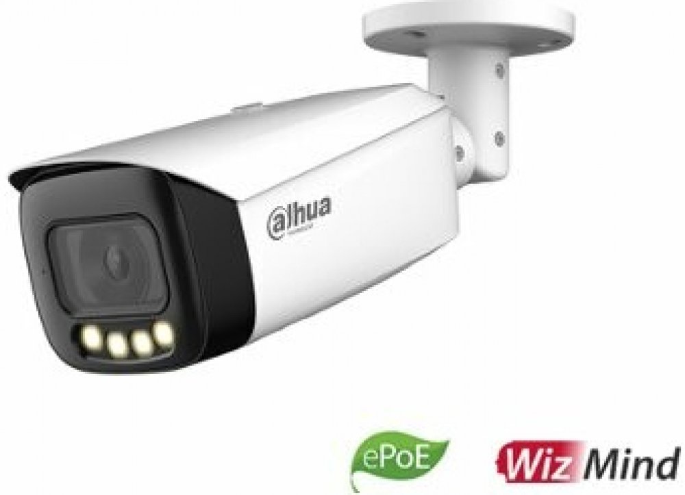 Full-color IP kamera WizMind série typu bullet nabízí rozlišení snímače 8 Mpx a je tak schopna snímat video v rozlišení 3840 x 2160 při 25/30 fps. Disponuje pevným objektivem f = 3,6 mm s úhlem záběru horizontálně až 91° a whiteLED (Warm light) přísvitem do 50 m. Optimalizace datového toku pomocí smart kodeku H.265+ a H.264+ snižuje celkové náklady na datová úložiště při zachování nejvyšší možné kvality obrazu. Kamera disponuje inteligentní videoanalýzou a spravovat ji lze skrze webový prohlížeč, nebo přes aplikaci pro chytré telefony. Samozřejmostí je přítomnost microSD slotu pro karty o velikosti až 256 GB. Kamera je vhodná pro venkovní umístění díky voděodolnosti dle certifikace IP67. Napájení DC 12 V nebo PoE (802.3af) + podpora ePoE. Technologie ePoE umožňuje připojení IP kamer Dahua až na vzdálenost 800 m s použitím metalické kabeláže.