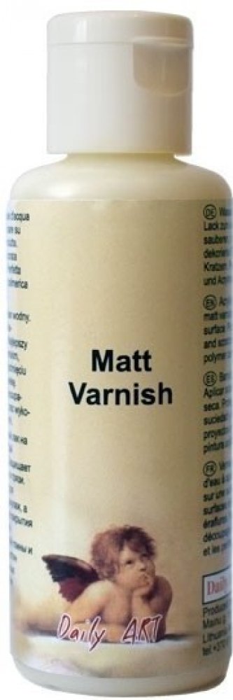 Matný lak 60 ml Daily ART. Akrylový lak na bázi vody. Skvělý pro dekupáž, polymerovou hmotu a akrylové malby. Lze také použít jako ředidlo pro barvy, laky a pasty Daily ART. Naneste na jakýkoliv pevný, čistý a suchý povrch. Po zaschnutí vytváří voděodolný povrch. Chrání dekorovaný povrch před špínou a poškrábáním. Pokud je vlhký, snadno se odstraňuje pomocí vody a mýdla.