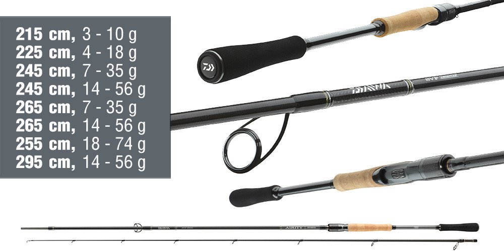 Hybridní koncept řady Airity Hybrid nabízí obrovské množství technologických vychytávek exkluzivní technologie stavby prutů DAIWA a kombinuje jedinečné komponenty s moderním designem. Pro koncové očko a dvě následující očka jsou použita originální očka Fuji SiC K, zatímco pro všechny následující očka jsou použita jedinečná karbonová očka DAIWA AGS. Tato hybridní koncepce jasně demonstruje pozoruhodné výhody oček AGS při praktickém použití – rychlá špička blanku SVF Nanoplus reaguje díky úspoře hmotnosti extrémně rychle a nehoupe se. Očka DAIWA AGS jsou přibližně o 40% lehčí než běžná SiC očka s kovovými rámečky stejné velikosti. Vynikající tvrdost a torzní pevnost karbonových oček okamžitě přenáší veškeré vibrace a kontakty přímo k blanku a do ruky. Výsledkem je neuvěřitelně citlivý kontakt s nástrahou, který podporuje detekci i těch nejjemnějších záběrů. Blanky jsou rovněž vybaveny exkluzivní technologií X45X. Toto speciální uspořádání uhlíkových vláken na povrchu blanku výrazně zlepšuje kompresi a vytváří tak nesrovnatelnou torzní pevnost při zatížení. Materiál X45X také zajišťuje skvělý karbonový vzhled povrchu blanku. Všechny modely se vyznačují extrémně rychlou akcí špičky s tuhou páteří – ideální pro dobré zaseknutí háčku na velké vzdálenosti. Exkluzivní sedlo navijáku DAIWA Air Sensor je vyrobeno z kompozitního uhlíkového materiálu, je extrémně lehké a odolné a velmi příjemné do dlaně. Dělená rukojeť z vysoce kvalitního AAA korku a EVA materiálu rovněž vizualizuje hybridní koncept této výjimečné řady. Všechny pruty od délky 2.4m obsahují vnitřní vyvažovací zátěž, která dále zlepšuje vyváženost a pocit při používání. Řada prutů Airity Hybrid pokrývá nejdůležitější metody lovu dravců a je vhodná zejména pro lov s gumovými nástrahami. Model o délce 2.95m byl speciálně vyvinut pro použití na velkých řekách, kanálech a jezerech a umožňuje přesné nahazování na vzdálená místa s nástrahami o hmotnosti až 50g. Pruty Airity Hybrid jsou dodávány v kvalitním bohatě polstrovaném transportním obalu, který pojme kompletně sestavený prut.