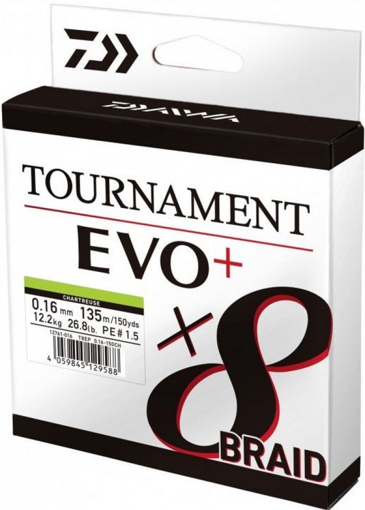 Dobře známá pletená šňůra Tournament 8 byla ještě zdokonalena, a tak vznikla verze Evo+. Zejména povrchový potah byl vylepšen větším množstvím silikonu, což vede k menšímu tření během náhozu a delším hodům. Navíc je redukován zvuk vznikající při průchodu očky. Díky tomu je nová šňůra Tournament 8 Braid Evo+ technicky jednou ze světově nejlepších šňůr na trhu. Povrch verze Evo+ se netrhá a nepraská...