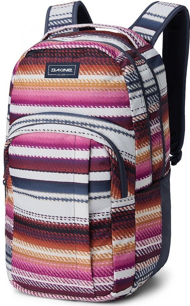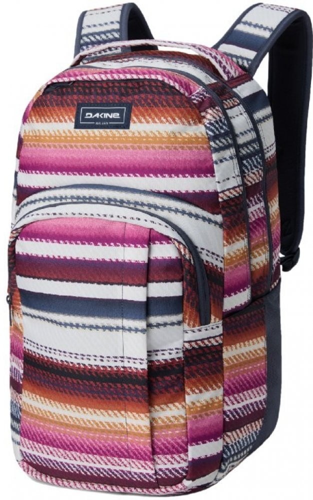 Stylový proužkovaný studentský batoh na běžné nošení, úložný prostor 33 litrů, mnoho kapes a přihrádek, termo kapsa na jídlo a pití, pohodlné popruhy a záda, přihrádka na 17" notebook. Batoh DAKINE Campus L 33L 2025. Batoh DAKINE Campus je jedním z nejprodávanějších modelů značky díky kvalitnímu zpracování a skvělé ceně. Školní batoh je vyroben z odolného materiálu a disponuje úložným prostorem 33 litrů. Model Campus nabízí dvě hlavní kapsy na zip. V největší je umístěna notebook přihrádka, která pojme až 17" notebook. V druhé kapse jsou oraganizační přihrádky a další kapsičky. Dále je zde poměrně velká izolovaná termo kapsa na jídlo a pití, polstrovaná kapsička na brýle, kapsička se svislým zipem a boční síťované přihrádky. Zádový panel a popruhy jsou lehce polstrované a nechybí zde ani možnost doladění velikosti. Hledáte-li vychytaný batoh do školy, prace či na výlety, pak je Dakine Campus vždy skvělou volbou, která kvalitně poslouží několik let. prostorově uzpůsoben pro 17" monitor velký vnitřní prostor několik kapes na zip organizační kapsa, polstrovaná kapsa na brýle a další kapsičky na zip pohodlný zádový panel a popruhy termo kapsa na jídlo či pití polstrované dno materiál odpuzuje vodu Materiál: recyklovaný polyester, nylon, recyklovaný polyvinyl chlorid Rozměry: 52 x 33 x 21 cm