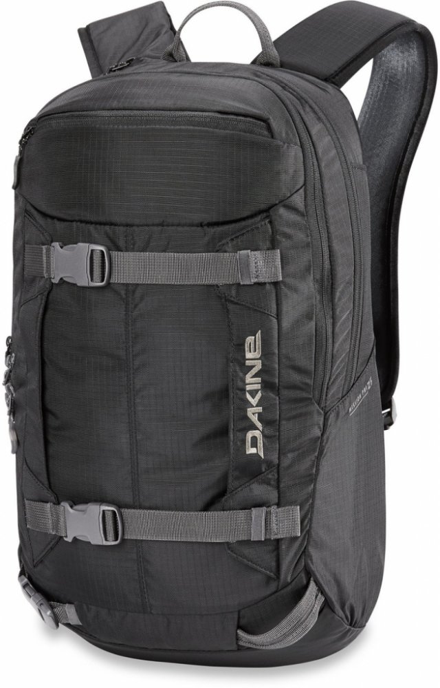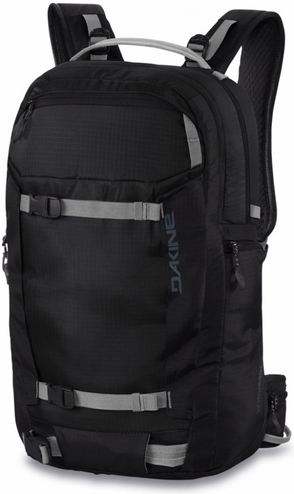 Batoh Mission Pro 25L značky Dakine nabízí kapsu na lopatu na sníh, sondu. Hlavní předností je horizontální a vertikální nošení prkna plus diagonální nošení lyží.