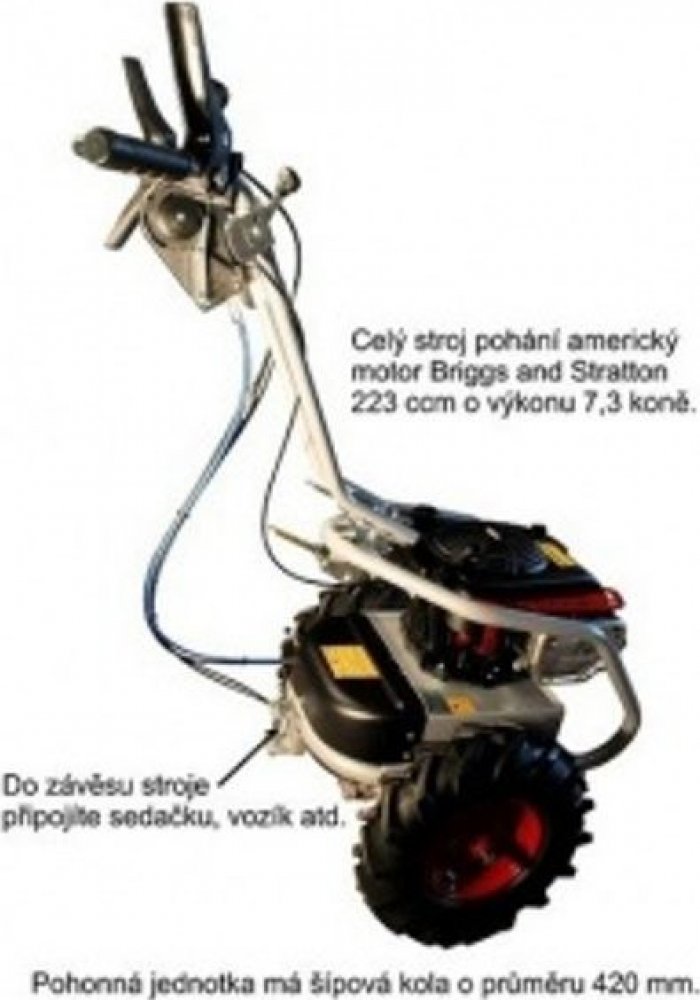 Velikou výhodou je, že je možné rychlost pojezdu přesně upůsobit prováděné práci a fyzickým možnostem obsluhy. V základním provedení je osazena motorem Briggs&Stratton 850 I/C o obsahu 190 cm3.