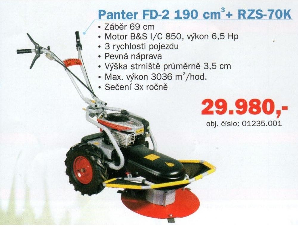 Do této chvíle jsme u tohoto stroje používali motor Briggs&Stratton 950 Series, protože má obsah motoru 223 ccm a 7,3 HP. Šlo o novou řadu motorů a očekávali jsme, že tato řada bude postupně rozšířena o provedení s litinovou vložkou válce, popřípadě doplněna i o olejový filtr a olejové čerpadlo, podobně jako motory 850 I/C. Bohužel i tři roky po jejich uvedení na trh se tyto motory dělají stále jen v jednom provedení s hliníkovým válcem a bez filtrace oleje a požadovaná změna specifikace není ani ve výhledu firmy Briggs&Stratton. Proto jsme od jejich dalšího používání upustili a nadále osazujeme stroje Panter FD-2 a Panter FD-2H výhradně motory Briggs&Stratton 850 I/C, které mají obsah motoru 190 ccm, výkon 6,5 Hp, ale jsou v provedení pro nejnáročnější průmyslové a profesionální nasazení, protože mají litinovou vložku válce, karburátor uzpůsobený pro práci i ve větších svazích, olejový filtr a olejové čerpadlo. Motory I/C jsou pro nás svým provedením zárukou, že obstojí v náročných provozních podmínkách.