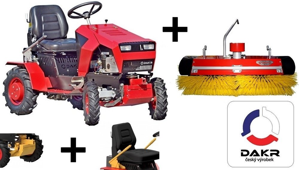 Veškeré čelní pracovní nástavce jsou Vám již teď k dispozici, jedná se o dvoubunovou sekačku, diskovou žací lištu, pásový obraceč píce, cepákový mulčovač, zametací kartáč a různé další příslušenství.