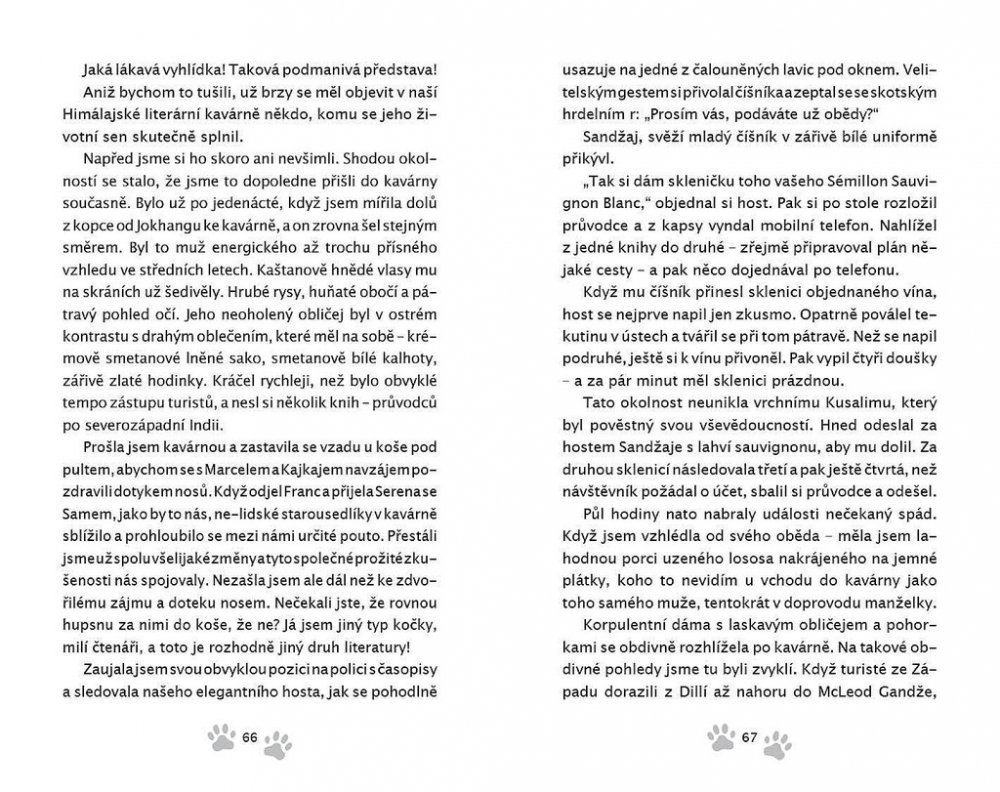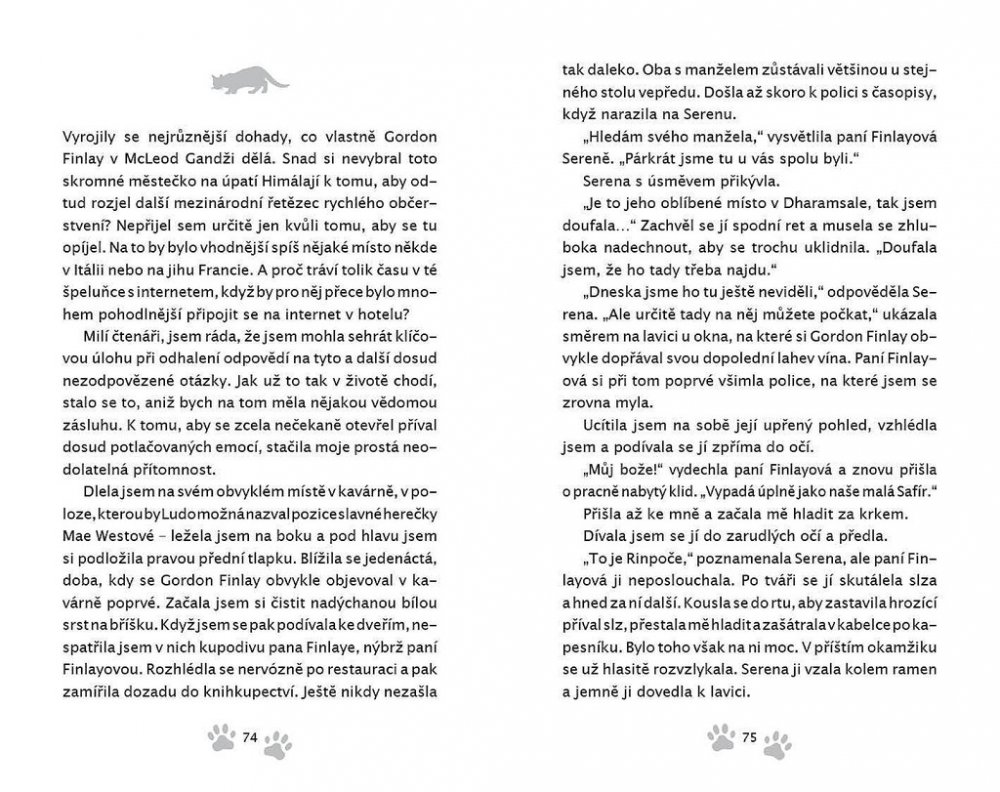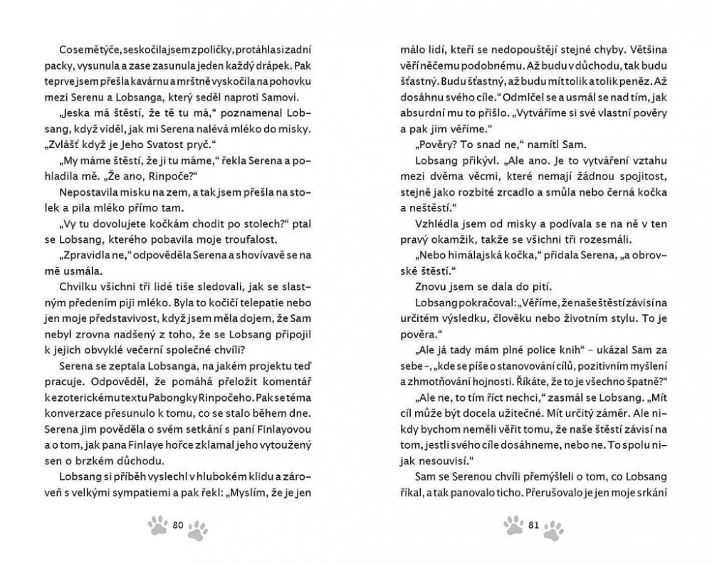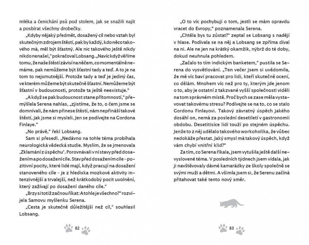 Než dalajlama odjede na přednáškové turné do Ameriky, uloží své milované kočce Jesce (JSK, Její Svatosti Kočce) určitý úkol: objevit pravou příčinu štěstí. Plnění úkolu zavede kočku do netušených dobrodružství! Napínavá honička ulicemi McLeod Gandže ji dovede k nečekanému zjištění o tom, jak je nebezpečná sebestřednost. Setkání s tajemným jogínem Tarčinem jí odhalí vlastní minulost – což má dramatické následky pro nás pro všechny. Útržky rozhovorů, které vyslechne v Himálajské literární kavárně, jí pomůžou odhalit podobnosti mezi vědou a buddhismem v klíčovém tématu štěstí – ať už při tom poslouchá vážené univerzitní profesory a psychology, vysoce postavené lamy nebo slavné spisovatele.Jiskřivá moudrost, srdečnost a kapka rošťáctví v Dalajlamově kočce a umění příst nám kouzelným způsobem ukazuje, proč se z Jesky stává jedna z nejmilovanějších koček na světě. Jaký je tedy skutečný důvod předení? Toto tajemství dalajlama šeptem prozradí, až se vrátí z cesty – jenom uším Jesky a těm, s nimiž má jeho kočka karmické spojení… což jste, milí čtenáři, právě vy! Tato knížka je volným pokračováním knížky Dalajlamova kočka.