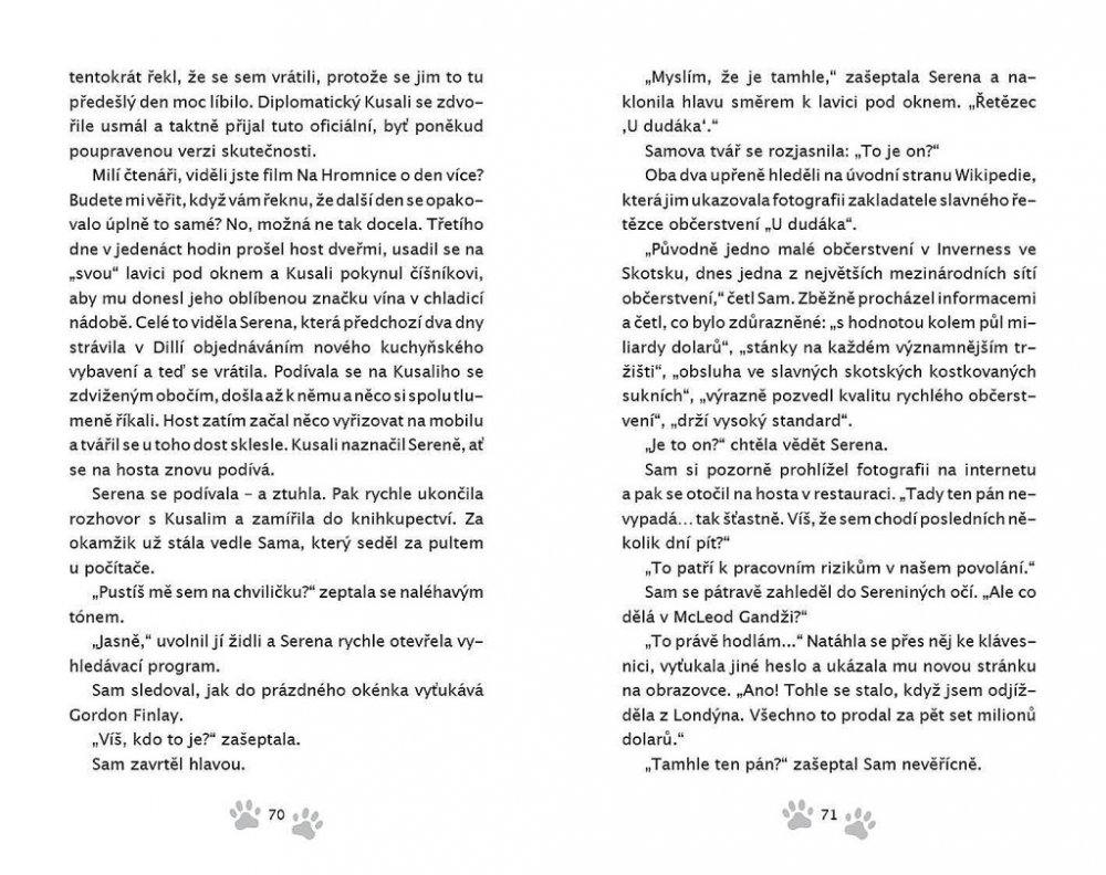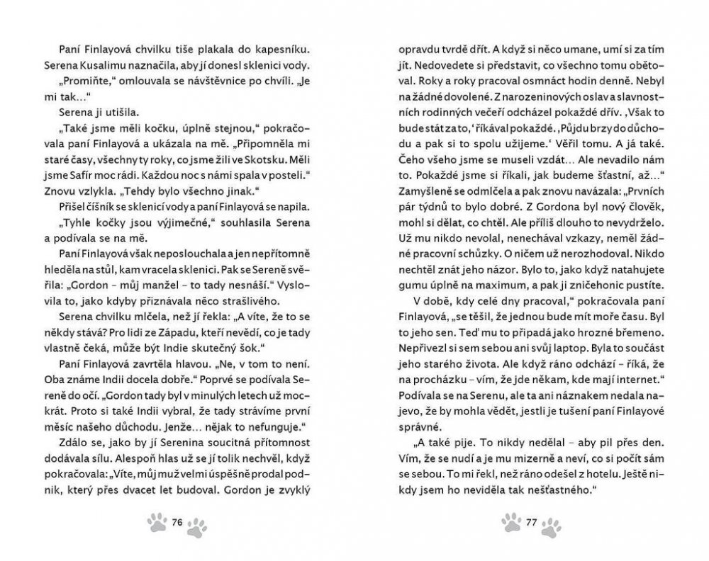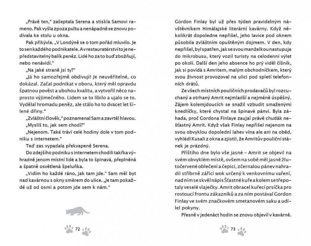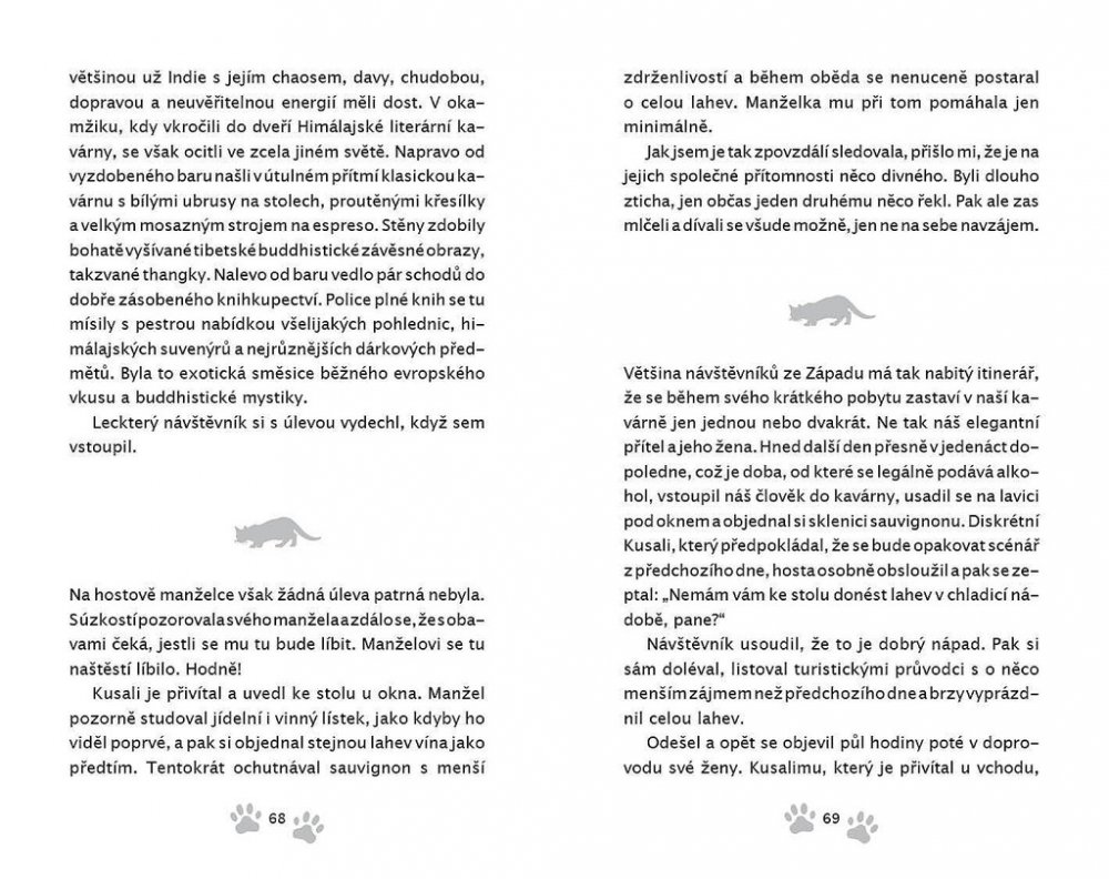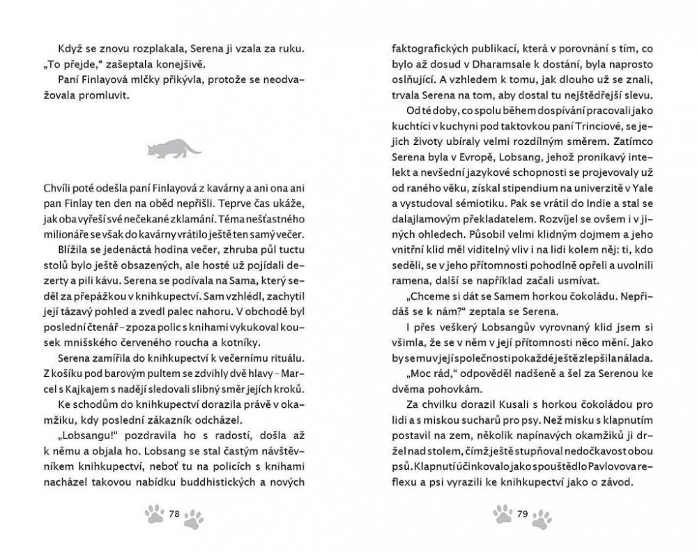 Než dalajlama odjede na přednáškové turné do Ameriky, uloží své milované kočce Jesce (JSK, Její Svatosti Kočce) určitý úkol: objevit pravou příčinu štěstí. Plnění úkolu zavede kočku do netušených dobrodružství! Napínavá honička ulicemi McLeod Gandže ji dovede k nečekanému zjištění o tom, jak je nebezpečná sebestřednost. Setkání s tajemným jogínem Tarčinem jí odhalí vlastní minulost – což má dramatické následky pro nás pro všechny. Útržky rozhovorů, které vyslechne v Himálajské literární kavárně, jí pomůžou odhalit podobnosti mezi vědou a buddhismem v klíčovém tématu štěstí – ať už při tom poslouchá vážené univerzitní profesory a psychology, vysoce postavené lamy nebo slavné spisovatele.Jiskřivá moudrost, srdečnost a kapka rošťáctví v Dalajlamově kočce a umění příst nám kouzelným způsobem ukazuje, proč se z Jesky stává jedna z nejmilovanějších koček na světě. Jaký je tedy skutečný důvod předení? Toto tajemství dalajlama šeptem prozradí, až se vrátí z cesty – jenom uším Jesky a těm, s nimiž má jeho kočka karmické spojení… což jste, milí čtenáři, právě vy! Tato knížka je volným pokračováním knížky Dalajlamova kočka.