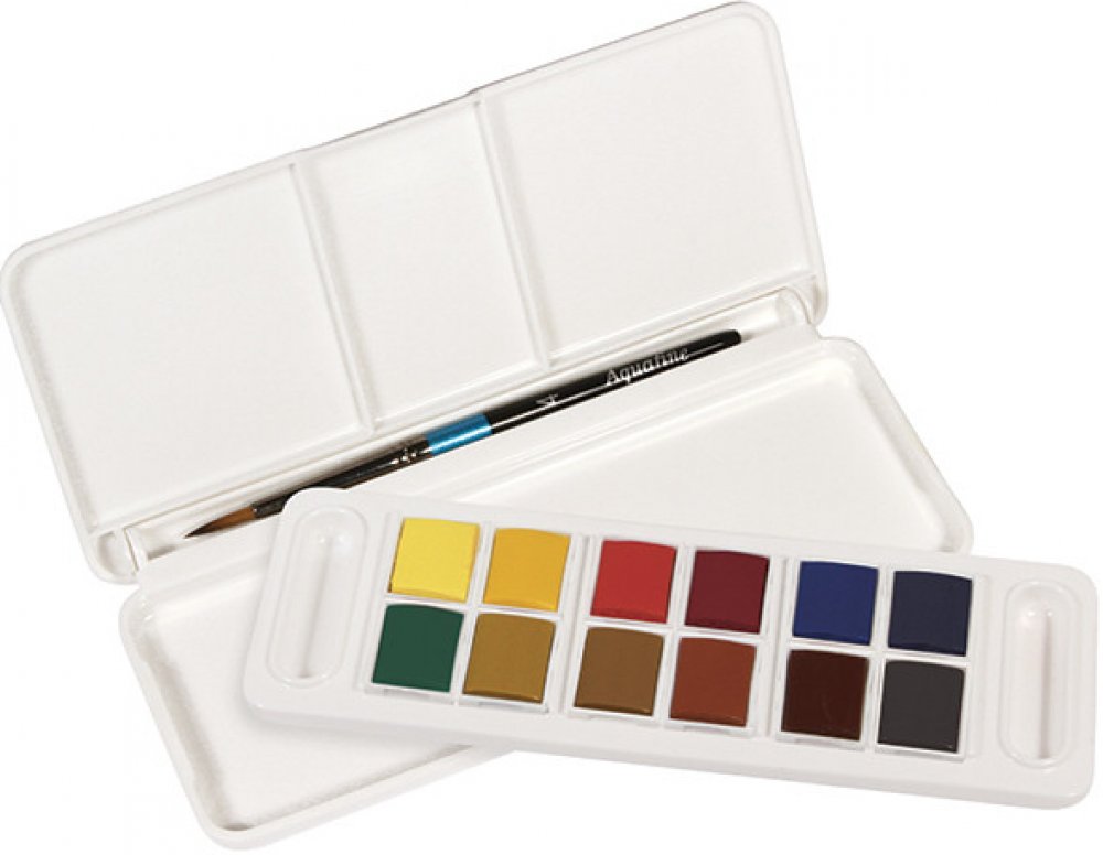 Sada obsahuje 12 akvarelových barev v polokostkách a 1 kulatý štětec.