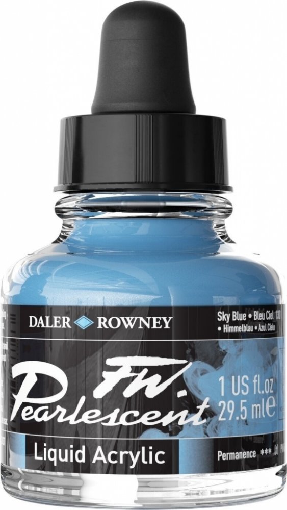 Perleťová akrylová tuš. Kolekce FW Ink zahrnuje komplexní sortiment profesionálních tuší na bázi akrylu ve standardních, neonových a perleťových barvách. Roztok akrylových inkoustů FW je vysoce pigmentován a nabízí syté odstíny, které lze rozředit na jemnější tóny. Umělci mohou tekutý akryl FW nanášet pomocí štětce, pipety nebo airbrushu.Všestrannost vodou rozpustného roztoku v kombinaci s různými způsoby nanášení poskytuje umělcům nekonečné možnosti technik, od složité práce s liniemi až po rozsáhlé tahy štětcem.Expresivní tekutost těchto akrylových tuší je vhodná pro výtvarné umělce, ilustrátory, grafiky, kaligrafy, dekorativní umělce a hobby malíře.Odolávají vyblednutí při vystavení světlu, aby hotová díla zůstala živá, i když visí v jasně osvětlených prostorách.Pokud potřebujete konkrétní odstín, jednoduše smíchejte dva nebo více inkoustů FW a vytvořte nekonečné množství barev v přesném tónu, který potřebujete.Smíchejte je s vodou, abyste zředili bohatost barev a dosáhli jemných tónů, ideální na akvarelové efekty, jako například při technice washing.Akrylové tuše FW jsou pigmentované, voděodolné umělecké barvy na akrylové bázi s vysokým stupněm světlostálosti a mísitelnosti. Akrylové tuše FW lze používat přímo z kapátka nebo ředěné pro dosažení nejjemnějších tónů.Perleťová tuš FW PearFW má třpytivé složení, které lze použít k dodání třpytivého nádechu vašim uměleckým dílům. Ať už doplňujete dekorativní umění, jako jsou blahopřání, pasparty a rámy, nebo pokrýváte svá díla oslnivými efekty, perleťový inkoust poskytuje vysoký lesk a průsvitnost pro bezkonkurenční lesk.Pigmentovaný tuš na akrylové bázi.Vysoká světlostálost (3*).Plně mísitelné barvy.Použitelné s airbrushem a technickými rty.Vyrobeno v Anglii.