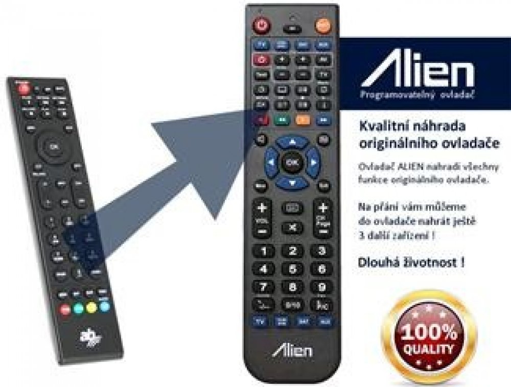 Dálkový ovladač AB Cryptobox 600, 650, 652 HD Kvalitní náhradní dálkové ovládání jiného vzhledu pro Satelitní příjímač AB Cryptobox. Pod značkou ALIEN získáte kvalitní a levnou náhradu originálního ovladače, který již není často k dispozici nebo je několikanásobně dražší. Ovladač ALIEN svou kvalitou a mechanickým zpracováním často předčí originální ovladače a zaručuje tak dlouhou životnost. Náhrada za originální ovladač AB Cryptobox Ovladač je kompatibilní s těmito modely satelitních příjímačů: AB Cryptobox 600, 650, 652 HD Návod k použití dálkového ovladače ALIEN Ovladač je naprogramován na vašem zařízení. ALIEN nahrazuje všechny funkce originálního ovladače. Po vložení baterií nejprve stiskněte tlačítko pro volbu typu zařízení (TV / VCR / DVD / SAT / AUX) a následně můžete ovládat zařízení. Spolu s ovladačem získáte jednoduchý popis s rozložením tlačítek vzhledem k původnímu ovladači. Ovládejte až 4 zařízení jedním ovladačem Ovladač ALIEN 4v1 lze naprogramovat až na 4 přístroje. Znamená to, že můžete jedním ovladačem ovládat současně satelitní přijímač, televizor nebo třeba DVD. Chcete-li objednat ovladač naprogramovat ještě další zařízení, napište nám do objednávky do poznámky přesný typ zařízení dálkového ovládání vašeho zařízení. Doprogramování ovladače o další zařízení je zpoplatněno částkou 50 Kč. Jaké baterie jsou vhodné do dálkového ovladače? Doporučujeme koupit Alkalické baterie GP ULTRA ALKALINE! Oproti běžným alkalickým bateriím dodávají až o 30% více energie. Výkonnost těchto baterií se nejlépe vynikne při použití v prostředích se středním odběrem proudu jako např.: různé ruční nebo stolní digitální zařízení, dálkové ovladače, herní konzole, meteostanice a svítilny. Tyto baterie obsahují ochranu proti vytečení a mají skladovatelnost až 7 let. Univerzální ovladač ALIEN 4v1 Kvalitní náhradní dálkový ovladač pro váš televizor, satelitní přijímač, DVD a HIFI