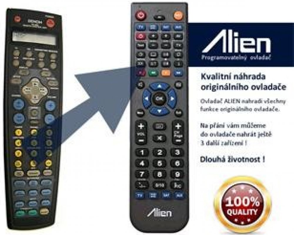Dálkový ovladač Denon RC-884 Kvalitní náhradní dálkové ovládání jiného vzhledu pro DVD Denon Pod značkou ALIEN získáte kvalitní a levnou náhradu originálního ovladače, který již často není k dispozici nebo je několikanásobně dražší. Ovladač ALIEN svou kvalitou a mechanickým zpracováním často předčí originální ovladače a zaručuje vám tak dlouhou životnost. Náhrada za originální ovladač Denon RC-884 Ovladač je kompatibilní pro řadu DVD: AVR3802, AVR-3802, AVR3801, AVR-3801, AVR3800, AVR-3800, AVR1082, AVR-1082 Návod k použití dálkového ovladače ALIEN Ovladač obdržíte naprogramovaný na vaše zařízení. ALIEN nahrazuje všechny funkce originálního ovladače.Po vložení baterií nejprve stiskněte tlačítko pro volbu typu zařízení (TV / VCR/DVD / SAT / AUX) a následně můžete ovládat vaše zařízení. Spolu s ovladačem obdržíte jednoduchý popis s rozpisem tlačítek vzhledem k originálnímu ovladači. Ovládejte až 4 zařízení jedním ovladačem Ovladač ALIEN 4v1 lze naprogramovat až na 4 přístroje. Znamená to, že můžete jedním ovladačem ovládat zároveň satelitní přijímač, televizor nebo třeba DVD. Chcete-li do objednaného ovladače naprogramovat ještě další přístroje, tak nám v objednávce do poznámky napište přesný typ dálkového ovladače vašeho zařízení. Doprogramování ovladače o další zařízení je zpoplatněno částkou 50 Kč. Univerzální ovladač ALIEN 4v1 Kvalitní náhradní dálkový ovladač pro váš televizor, satelitní přijímač, DVD a HIFI