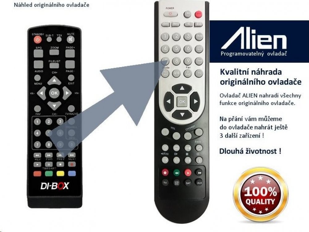 Ovladač ALIEN 4v1 lze naprogramovat až na 4 přístroje. Znamená to, že můžete jedním ovladačem ovládat současně satelitní přijímač, televizor nebo třeba DVD. Chcete-li objednat ovladač naprogramovat ještě další zařízení, napište nám do objednávky do poznámky přesný typ zařízení dálkového ovládání vašeho zařízení.