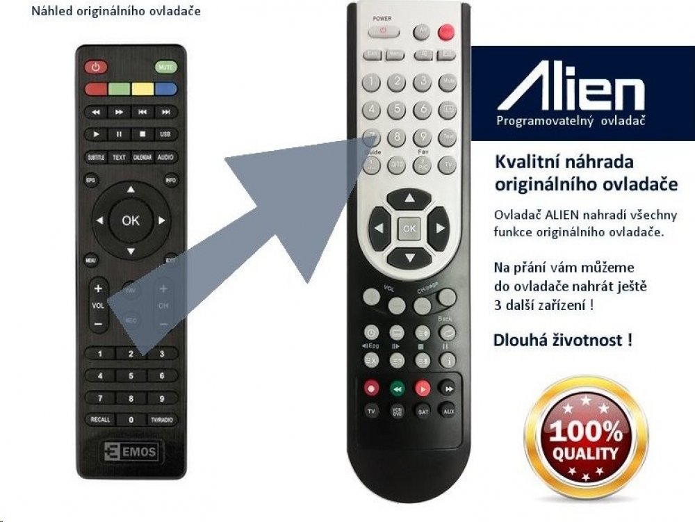 Ovladač je naprogramován na vaše zařízení. ALIEN nahrazuje všechny funkce originálního ovladače.