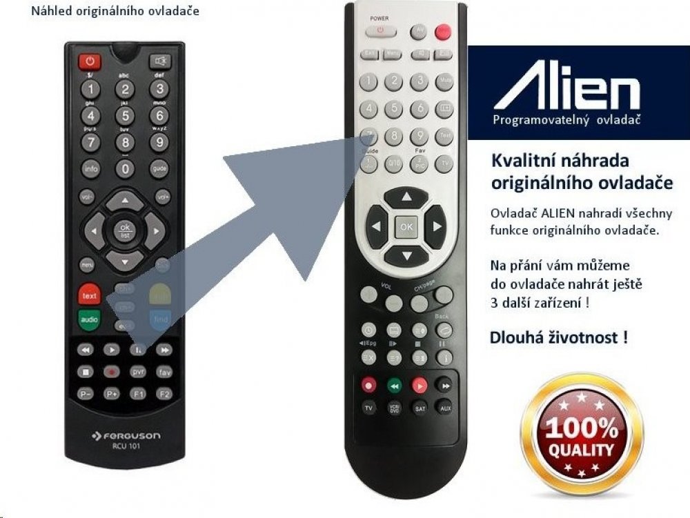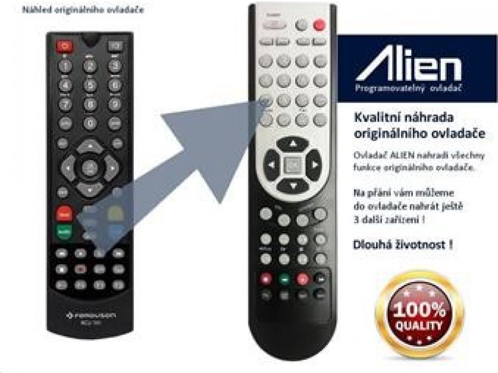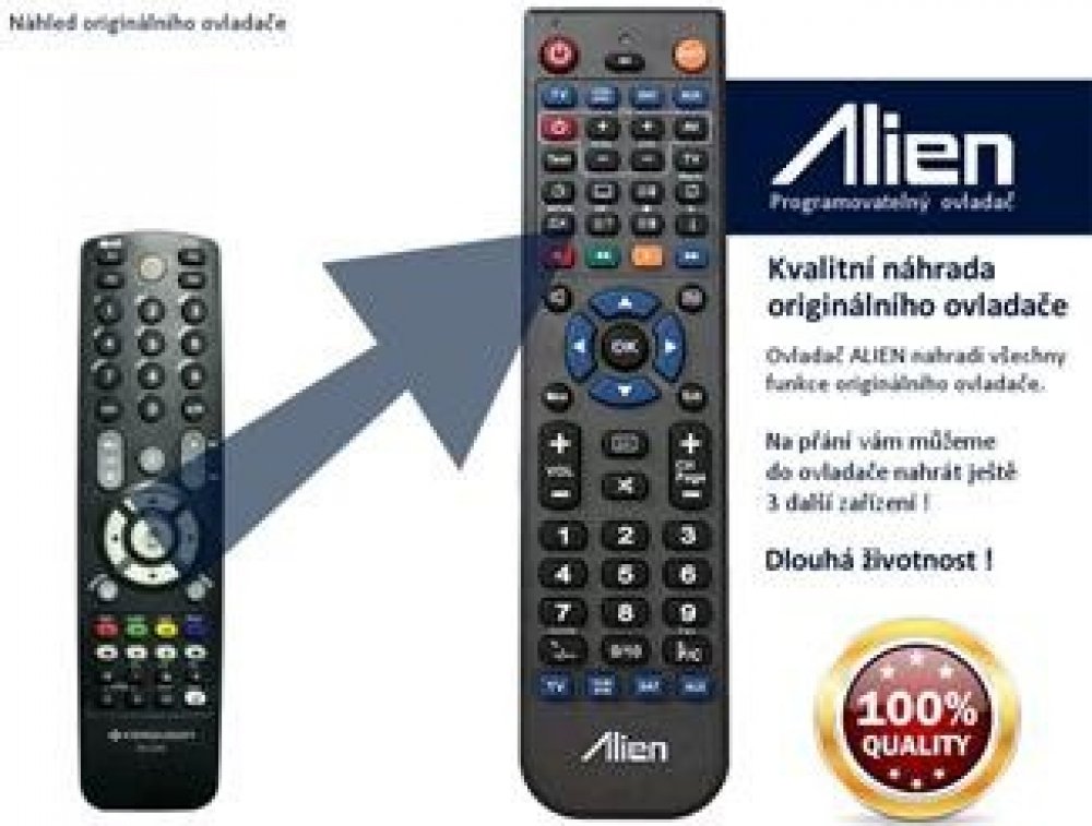 Ovladač ALIEN 4v1 lze naprogramovat až na 4 přístroje. Znamená to, že můžete jedním ovladačem ovládat současně satelitní přijímač, televizor nebo třeba DVD. Chcete-li objednat ovladač naprogramovat ještě další zařízení, napište nám do objednávky do poznámky přesný typ zařízení dálkového ovládání vašeho zařízení.