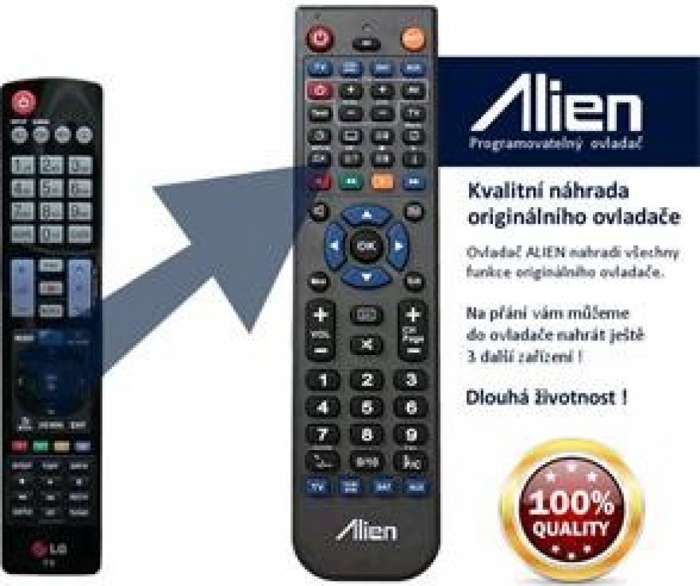 Dálkový ovladač LG AKB73756565 Kvalitní náhradní dálkové ovládání jiného vzhledu pro televizor LG. Pod značkou ALIEN získáte kvalitní a levnou náhradu originálního ovladače, který již často není k dispozici nebo je několikanásobně dražší. Ovladač ALIEN svou kvalitou a mechanickým zpracováním často předčí originální ovladače a zaručuje vám tak dlouhou životnost. Náhrada za originální ovladač: AKB73756565, AKB74455401 Ovladač je kompatibilní s těmito modely televizorů: 22LB475U, 22LB290U, 22LB4900, 22LB5700, 22MA31, 22MA33, 22MN43, 22MN430, 24MN31, 24MN33, 24MN43, 26LN450B, 26LN4500ZA, 26LN457B, 26LN460R, 37MA43, 27MA73, 29LN450B, 29LN460, 29LN33, 32LA6100ZB, 32LA6130, 32LA660S, 32LB550, 32LB570B, 32LB570V, 32LB280V, 32LB650, 32LF650V, 32LM620S, 32LM6200, 32LM6400, 32LM3410, 32LM660S, 32LN520VB, 32LN540B, 32LN5400, 32LN548C, 32LN549C, 32LN549E, 32LN570R, 32LN575S, 32LN577S, 32LN578S, 32LN613S, 32LP360H, 32LT380H, 32LT660H, 32LT760H, 37LM620S, 37LN640B, 37LN5400, 37LN548C, 37LN549C, 37LN549E, 37LP360H, 37LS570S, 39LB561, 39LB570V, 39LB5700, 39LB580V, 39LB650, 39LB651, 39LN570S, 39LN575S, 39LN577S, 39LN578, 42LA613, 42LA620S, 42LA640S, 42LA641S, 42LA660S, 42LA667S, 42LA690S, 42LA691S, 42LA740S, 42LA860V, 42LB570V, 42LB5700, 42LB580V, 42LB650, 42LB670, 42LB730, 42LM620S, 42LM6200, 42LM640S, 42LM6410, 42LM649S, 42LM660S, 42LM661S, 42LM669S, 42LM670S, 42LM6700, 42LM671S, 42LM760S, 42LM860V, 42LM765S, 42LN5200, 42LN5400, 42LN548C, 42LN549C, 42LN549E, 42LN570, 42LN575S, 42LN577S, 42LN578, 42LN613S, 42LP360H, 42LS5707S, 42UB820V, 43LF590V, 47LA6130, 47LA620S, 47LA640S, 47LA641S, 47LA660S, 47LA667S, 47LA6990S, 47LA691S, 47LA740S, 47LA860S, 47LB5800, 47LB650, 47LB652, 47LB670, 47LB671, 47LB700, 47LB730, 47LM620S, 47LM6200, 47LM640S, 47LM6410, 47LM649S, 47LM660S, 47LM670S, 47LM6700, 47LM671, 47LM760S, 47LM765S, 47LM860V, 47LM960V, 47LN5400, 47LN548C, 47LN549C, 47LN549E, 47LN613S, 47LS570S, 47LS577S, 49UB820V, 49UB830V, 50LA620S, 50LA660S, 50LA667S, 50LA690, 50LB650, 50LB570, 50LB580V, 50LN5400, 50PH470S, 50PH660S, 50PH670S, 50PM4700, 50PM670S, 50PM970S, 55EA870, 55EA970V, 55EA975, 55EA980, 55EA985, 55EC900V, 55LA620S, 55LA640S, 55LA641, 55LA660S, 55LA667S, 55LA690S, 55LA691S, 55LA740S, 55LA860V, 55LA965, 55LA670, 55LB561, 55LB580V, 55LB650, 55LB652, 55LB670, 55LB671, 55LB679, 55LB700, 55LB730, 55LB731, 55LB870, 55LM620S, 55LM6200, 55LM640S, 55LM660S, 55LM671S, 55LM760S, 55LM765S, 55LM860V, 55LM960V, 55UB820, 55UB830W, 60LA620S, 60LA740S, 60LB650, 60LM620S, 60LM640S, 60LM645S, 60PH670S, 60PM670S, 60PM690S, 60PM970S, 65EC970V, 65LM620S, 70LB650 Návod k použití dálkového ovladače ALIEN Ovladač obdržíte naprogramovaný na vaše zařízení. ALIEN nahrazuje všechny funkce originálního ovladače.Po vložení baterií nejprve stiskněte tlačítko pro volbu typu zařízení (TV / VCR/DVD / SAT / AUX) a následně můžete ovládat vaše zařízení. Spolu s ovladačem obdržíte jednoduchý popis s rozpisem tlačítek vzhledem k originálnímu ovladači. Ovládejte až 4 zařízení jedním ovladačem Ovladač ALIEN 4v1 lze naprogramovat až na 4 přístroje. Znamená to, že můžete jedním ovladačem ovládat zároveň satelitní přijímač, televizor nebo třeba DVD. Chcete-li do objednaného ovladače naprogramovat ještě další přístroje, tak nám v objednávce do poznámky napište přesný typ dálkového ovladače vašeho zařízení. Univerzální ovladač ALIEN 4v1 Kvalitní náhradní dálkový ovladač pro váš televizor, satelitní přijímač, DVD a HIFI