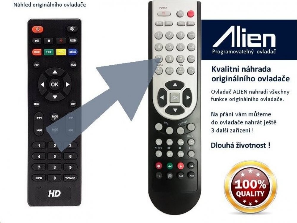 Ovladač ALIEN 4v1 lze naprogramovat až na 4 přístroje. Znamená to, že můžete jedním ovladačem ovládat současně satelitní přijímač, televizor nebo třeba DVD. Chcete-li objednat ovladač naprogramovat ještě další zařízení, napište nám do objednávky do poznámky přesný typ zařízení dálkového ovládání vašeho zařízení.
