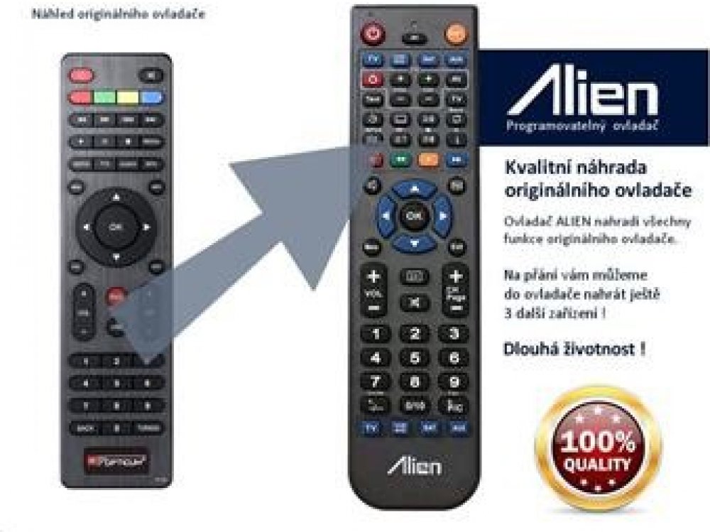 Ovladač ALIEN 4v1 lze naprogramovat až na 4 přístroje. Znamená to, že můžete jedním ovladačem ovládat současně satelitní přijímač, televizor nebo třeba DVD. Chcete-li objednat ovladač naprogramovat ještě další zařízení, napište nám do objednávky do poznámky přesný typ zařízení dálkového ovládání vašeho zařízení.