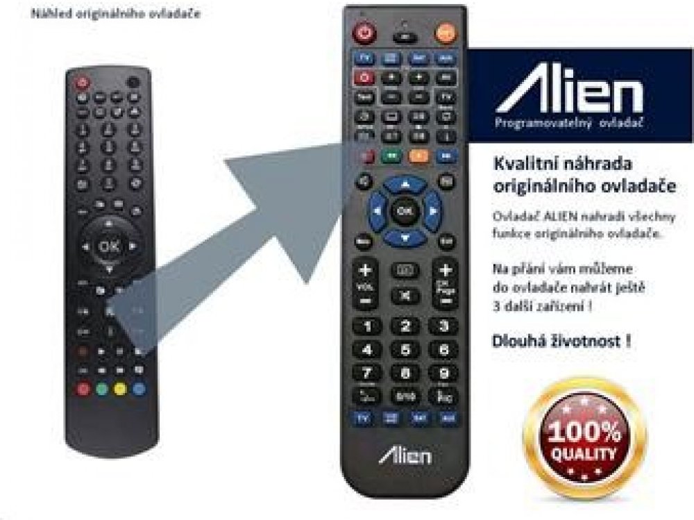 Ovladač ALIEN 4v1 lze naprogramovat až na 4 přístroje. Znamená to, že můžete jedním ovladačem ovládat současně satelitní přijímač, televizor nebo třeba DVD. Chcete-li objednat ovladač naprogramovat ještě další zařízení, napište nám do objednávky do poznámky přesný typ zařízení dálkového ovládání vašeho zařízení.