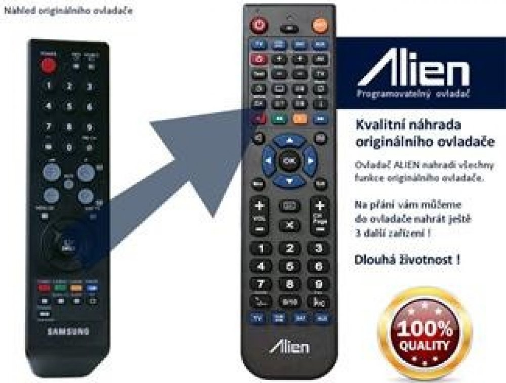 Dálkový ovladač ALIEN 4v1 umí současně ovládat až 4 přístroje, pokud nám tedy spolu s objednávkou pošlete modely vašich zařízení, tak vám ho můžeme naprogramovat podle vašich potřeb.