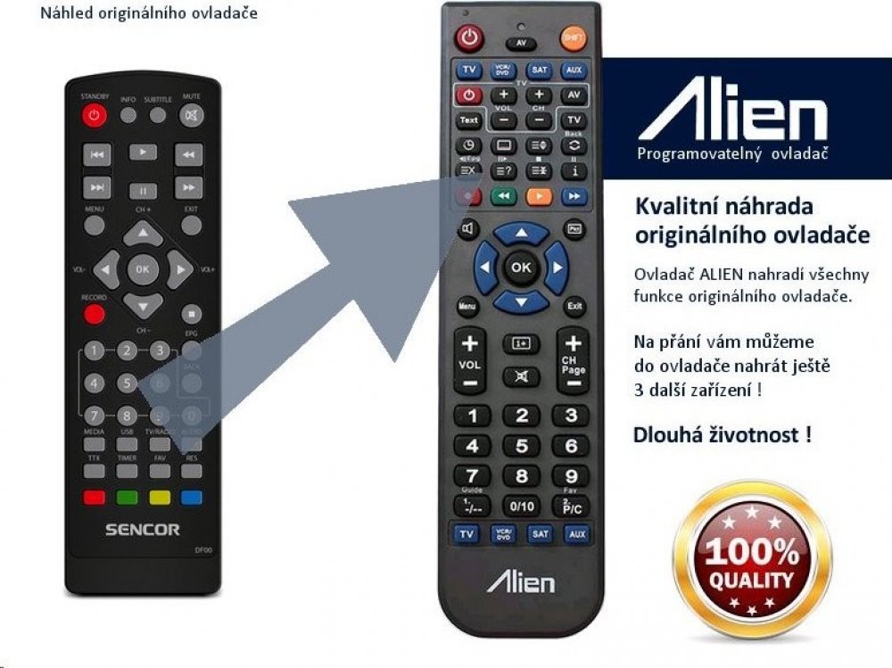 Ovladač ALIEN 4v1 lze naprogramovat až na 4 přístroje. Znamená to, že můžete jedním ovladačem ovládat současně satelitní přijímač, televizor nebo třeba DVD. Chcete-li objednat ovladač naprogramovat ještě další zařízení, napište nám do objednávky do poznámky přesný typ zařízení dálkového ovládání vašeho zařízení.