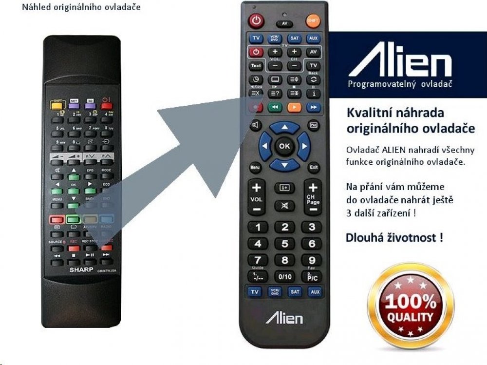 Ovladač ALIEN 4v1 lze naprogramovat až na 4 přístroje. Znamená to, že můžete jedním ovladačem ovládat současně satelitní přijímač, televizor nebo třeba DVD. Chcete-li objednat ovladač naprogramovat ještě další zařízení, napište nám do objednávky do poznámky přesný typ zařízení dálkového ovládání vašeho zařízení.
