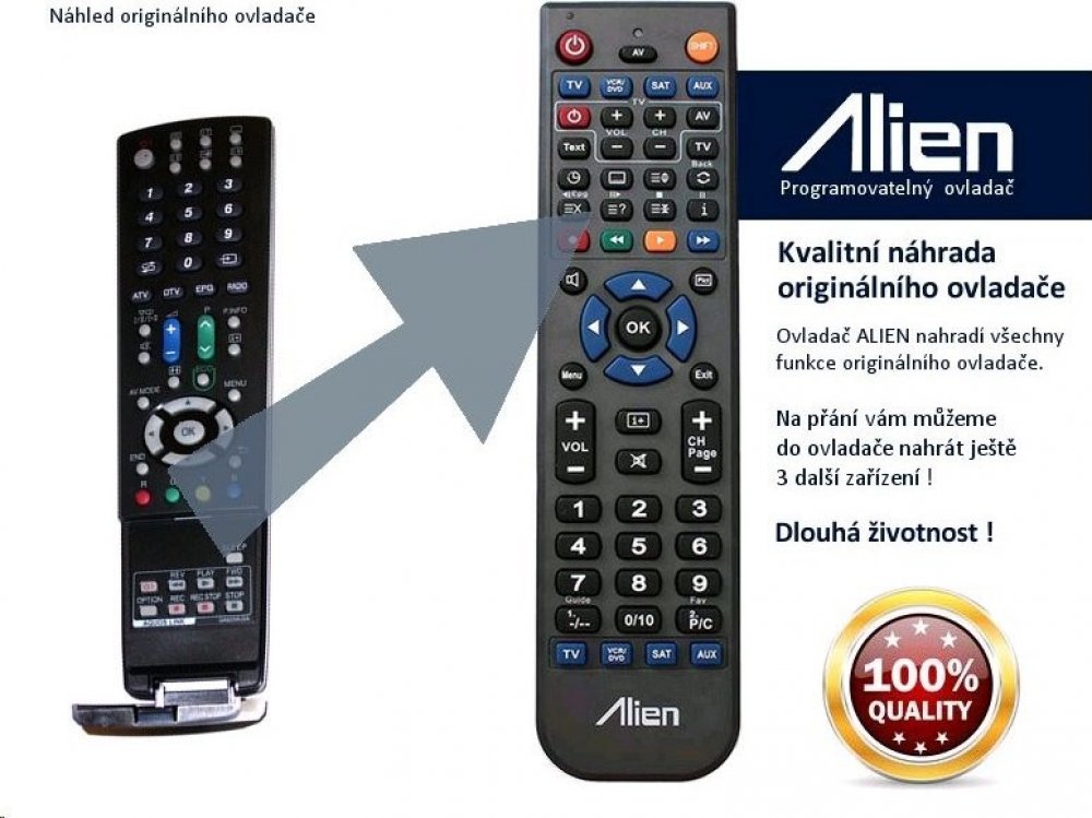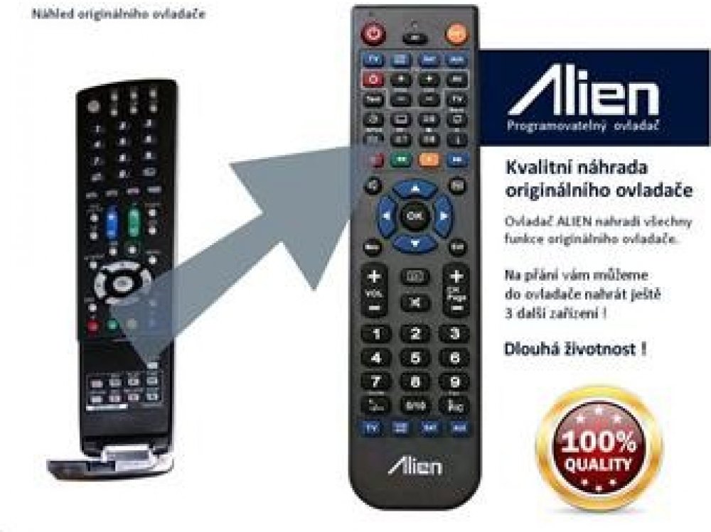 Ovladač ALIEN 4v1 lze naprogramovat až na 4 přístroje. Znamená to, že můžete jedním ovladačem ovládat současně satelitní přijímač, televizor nebo třeba DVD. Chcete-li objednat ovladač naprogramovat ještě další zařízení, napište nám do objednávky do poznámky přesný typ zařízení dálkového ovládání vašeho zařízení.