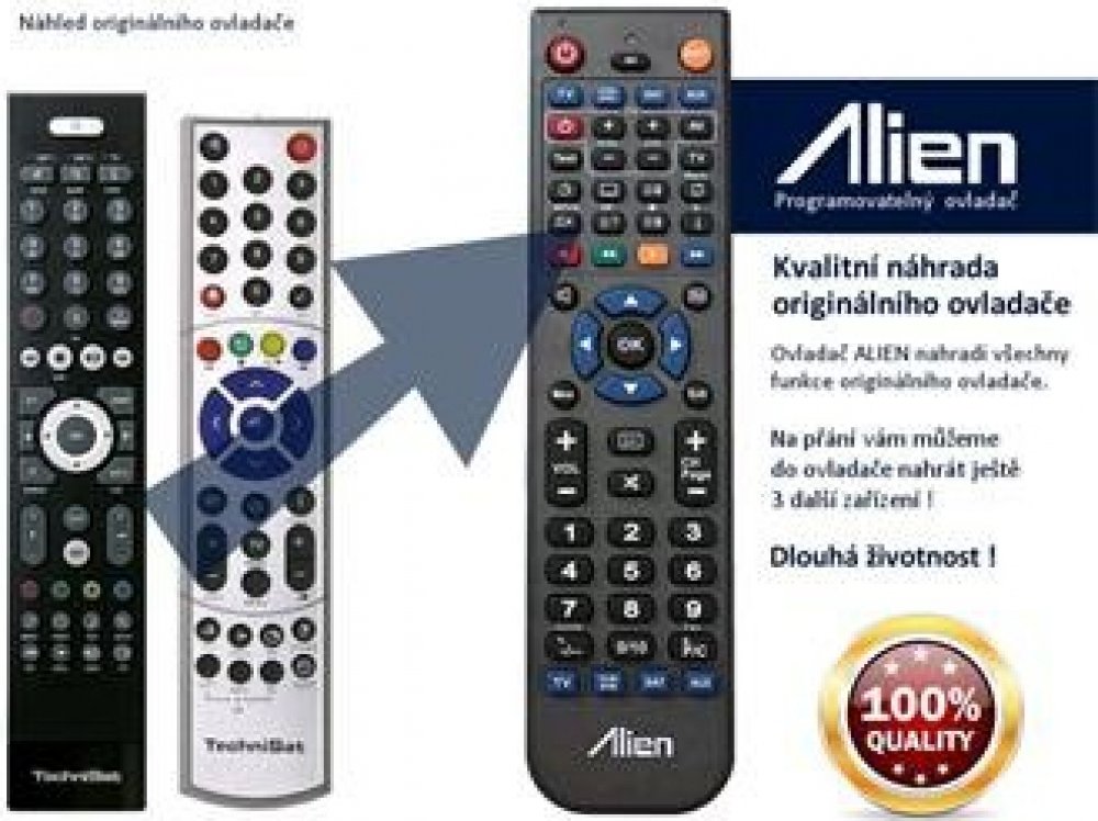 Náhradní dálkové ovládání pro přijímač Technisat Technistar SIR - plnohodnotné ovládání, všechny funkce stejné jako u originálního ovládání. K ovládání je přiložený rozpis tlačítek. Dálkové ovládání je připraveno k okamžitému použití, stačí vložit pouze baterie. Dodávaný ovladač ALIEN je plnohodnotnou náhradou originálního ovladače. Díky kvalitní konstrukci je zaručena dlouhá životnost ovladače. Vzhledem k tomu, že je ovladač programovatelný, tak ho můžete použít i při výměně vašeho přijímače za jiný - ovladač vám rádi přeprogramujeme na jiný model. Ovladač ALIEN 4v1 umí současně ovládat až 4 přístroje, pokud nám tedy spolu s objednávkou pošlete modely vašich zařízení, tak vám ho můžeme naprogramovat podle vašich potřeb.
