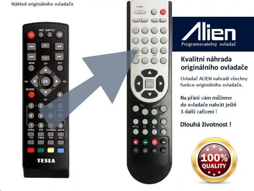 Ovladač ALIEN 4v1 lze naprogramovat až na 4 přístroje. Znamená to, že můžete jedním ovladačem ovládat současně satelitní přijímač, televizor nebo třeba DVD. Chcete-li objednat ovladač naprogramovat ještě další zařízení, napište nám do objednávky do poznámky přesný typ zařízení dálkového ovládání vašeho zařízení.