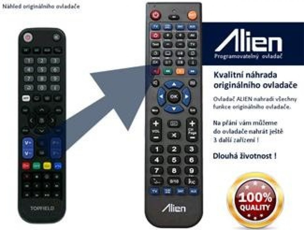 Náhradní dálkové ovládání pro satelitní přijímač Topfield TF S3000RHD - plnohodnotné ovládání, všechny funkce stejné jako u originálního ovládání. K ovládání je přiložený rozpis tlačítek. Dálkové ovládání je připraveno k okamžitému použití, stačí vložit pouze baterie. Dodávaný ovladač ALIEN je plnohodnotnou náhradou originálního ovladače. Díky kvalitní konstrukci je zaručena dlouhá životnost ovladače. Vzhledem k tomu, že je ovladač programovatelný, tak ho můžete použít i při výměně vašeho přijímače za jiný - ovladač vám rádi přeprogramujeme na jiný model. Ovladač ALIEN 4v1 umí současně ovládat až 4 přístroje, pokud nám tedy spolu s objednávkou pošlete modely vašich zařízení, tak vám ho můžeme naprogramovat podle vašich potřeb.