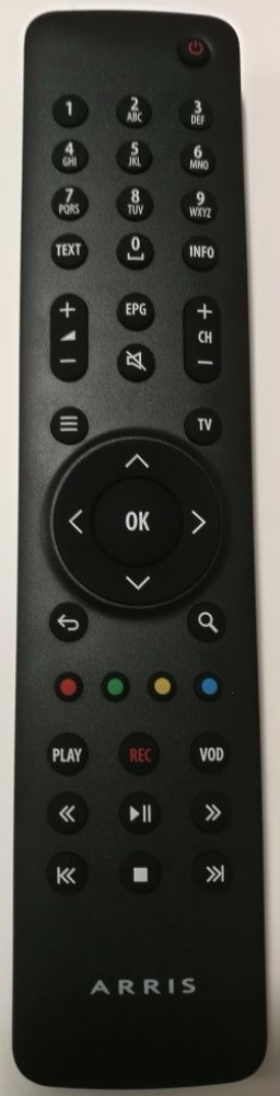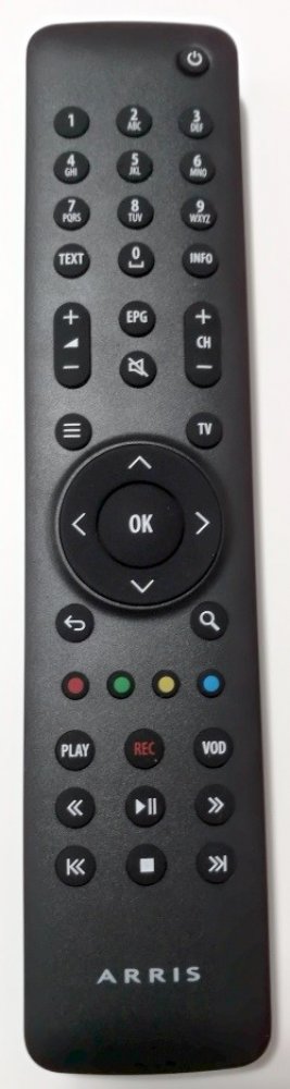 Arris VIP1113L. Ovladač 593255-002-00, 593860-005-00 nebo 593860-004-00 . PŮVODNÍ RÁDIOVÝ OVLADAČ SE JIŽ NEVYRÁBÍ. Originální náhrada funguje stejně, jen se při ovládání musí mířit na přístroj.