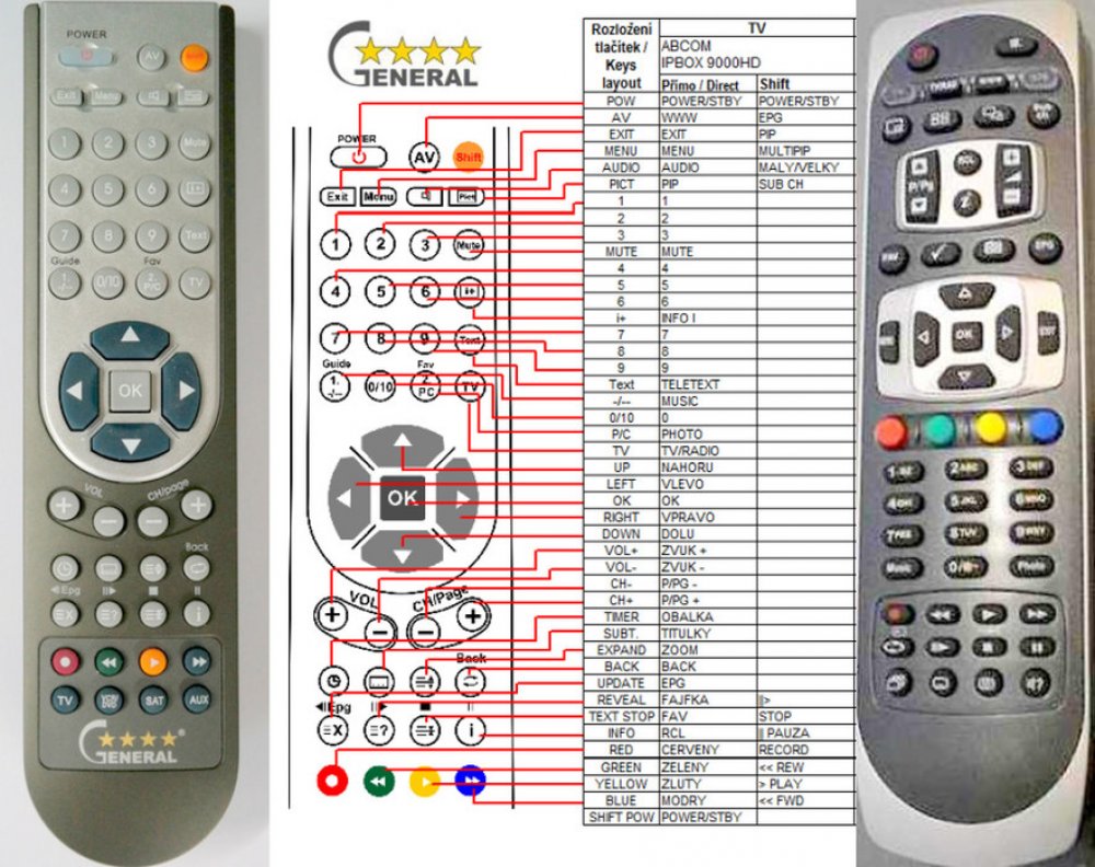 Náhradní dálkový ovladač AB IPBOX 9000HD OK+2 - 100% náhrada 1:1 za originální dálkový ovladač. Dálkový ovladač byl vyvinut speciálně na míru pro tyto modely značky AB IPBOX:9000HD, IPBOX 9000, IPBOX9000. (Nemusí zde být uvedeny úplně všechny kompatibilní modely. Pokud si nejste jisti, sdělte nám svůj model (použijte online chat, e-mail, telefon), neprodleně zkontrolujeme a ověříme, zda je tento ovladač kompatibilní s Vaším přístrojem. Za poskytnutou informaci ručíme.) Ovladač je dodáván ve verzi značkového dálkového ovladače General 4 (zobrazen vlevo). Garantujeme Vám, že dostanete ovladač, který plně nahradí Váš původní originální ovladač a bude mít naprosto všechny funkce stejné.Není to univerzální ovladač, ale ovladač, který je naprogramován a přímo určen pro modely přístrojů uvedené výše. Není třeba žádné párování, žádné kódy. Obdržíte od nás ovladač, který je připraven k použití - jediné, co musíte udělat, je vložit baterie a ovladač hned funguje. Podívejte se na obrázek ovladače a ujistěte se, že jsou v tabulce všechny funkce jako na původním originálním ovladači. Jedná se o plnohodnotný náhradní dálkový ovladač (není to „univerzál“). Má naprosto všechny funkce přesně jako originální ovladač. Záruční lhůta na ovladač je 3 roky. Dodáván také jednoduchý návod s mapováním funkcí. DOPLŇKOVÁ FUNKCE: Tento dálkový ovladač je možno naprogramovat na 1-4 zařízení (celkem tedy 4). Budete moci jedním ovladačem ovládat několik různých přístrojů jedním ovladačem. Pokud nám do komentáře v objednávce napíšete modely dalších přístrojů, naprogramujeme Vám ovladač na všechny. Za tuto doplňkovou službu bude naúčtován příplatek k ceně ovladače 50 Kč: více informacíV případě, že v budoucnu vyměníte/obměníte Vaši domácí elektroniku, jsme schopni Vám tento ovladač přeprogramovat na naprosto jakékoliv nové/á zařízení. Ovladač General přežije Váš stávající přístroj!