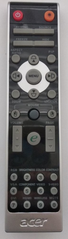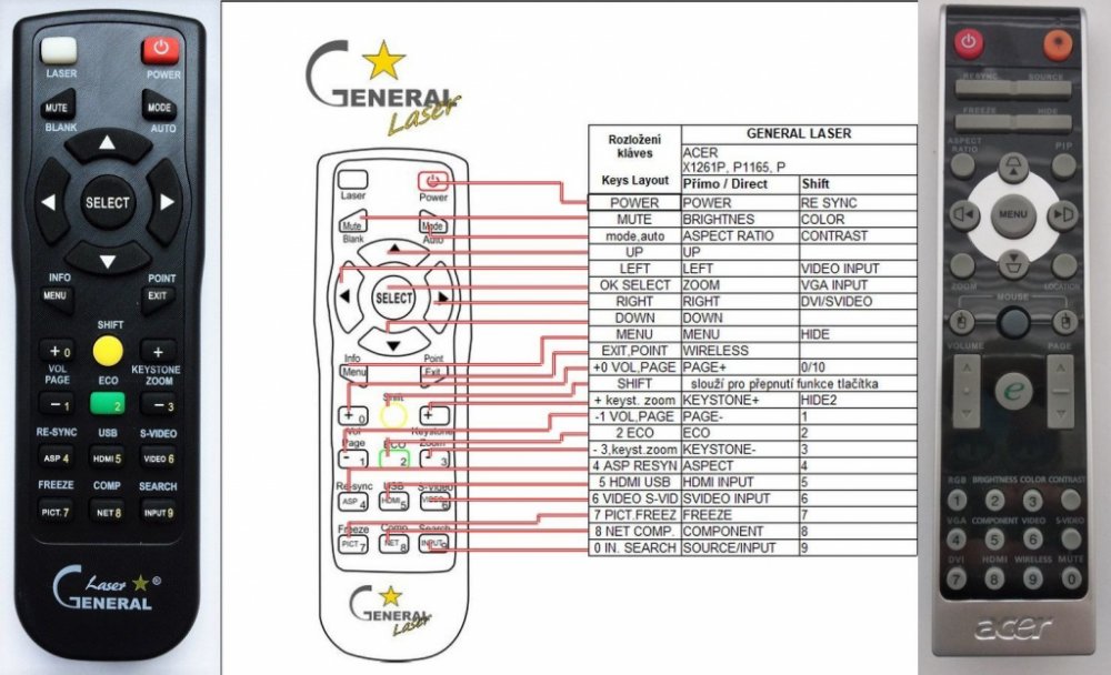 Náhradní dálkový ovladač ACER IR2508 - 100% náhrada 1:1 za originální dálkový ovladač. Dálkový ovladač byl vyvinut speciálně na míru pro tyto modely značky ACER:DNX0609, P1120, P1165, P1165P, P1166, P1200, P1200B, P1201B, P1203, P1206P, P1220, P1265, P1265P, P1266, P1320, P1320W, P5260, P5260I, P5270, P5280, P5370W, P7200I, P7203B, P7205B, P7270I, P7280, P7290, P7500, PD117D, PD126D, PD311, PD323, PD523P, PD525P, PD527P, PD726W, PD727, X1120, X1120H, X1220, X1220H, X1273, X1320, X1320WH, XD1150, XD1150D, XD1250, XD1250D. (Nemusí zde být uvedeny úplně všechny kompatibilní modely. Pokud si nejste jisti, sdělte nám svůj model (použijte online chat, e-mail, telefon), neprodleně zkontrolujeme a ověříme, zda je tento ovladač kompatibilní s Vaším přístrojem. Za poskytnutou informaci ručíme.)Plně nahrazuje také tyto dálkové ovladače: GRC39M31Ovladač je dodáván ve verzi značkového dálkového ovladače General LASER (zobrazen vlevo). Garantujeme Vám, že dostanete ovladač, který plně nahradí Váš původní originální ovladač a bude mít naprosto všechny funkce stejné.Není to univerzální ovladač, ale ovladač, který je naprogramován a přímo určen pro modely projektorů uvedené výše. Není třeba žádné párování, žádné kódy. Obdržíte od nás ovladač, který je připraven k použití - jediné, co musíte udělat, je vložit baterie a ovladač hned funguje. Jedná se o plnohodnotný náhradní dálkový ovladač speciálně navržen pro projektory (není to „univerzál“). Má naprosto všechny funkce přesně jako originální ovladač. Ovladač má přidanou funkci LASEROVÉ UKAZOVÁTKO. Dodáván také jednoduchý návod s mapováním funkcí.V případě, že v budoucnu vyměníte Váš projektor za jinou značku/model, jsme schopni Vám tento ovladač přeprogramovat na naprosto jakékoliv nové/á zařízení. Ovladač General LASER přežije Váš stávající přístroj!