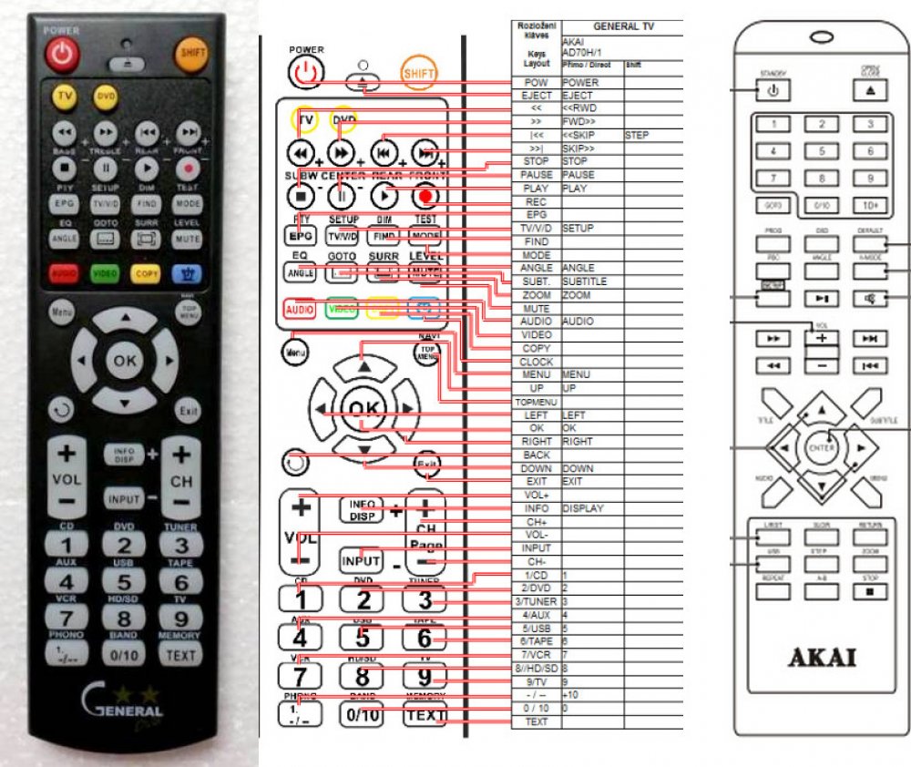 Náhradní dálkový ovladač AKAI AD70H - 100% náhrada 1:1 za originální dálkový ovladač. Dálkový ovladač byl vyvinut speciálně na míru pro tyto modely značky AKAI:AD70H. (Nemusí zde být uvedeny úplně všechny kompatibilní modely. Pokud si nejste jisti, sdělte nám svůj model (použijte online chat, e-mail, telefon), neprodleně zkontrolujeme a ověříme, zda je tento ovladač kompatibilní s Vaším přístrojem. Za poskytnutou informaci ručíme.) Ovladač je dodáván ve verzi značkového dálkového ovladače General DVD/AUDIO (zobrazen vlevo). Garantujeme Vám, že dostanete ovladač, který plně nahradí Váš původní originální ovladač a bude mít naprosto všechny funkce stejné.Není to univerzální ovladač, ale ovladač, který je naprogramován a přímo určen pro modely přístrojů uvedené výše. Není třeba žádné párování, žádné kódy. Obdržíte od nás ovladač, který je připraven k použití - jediné, co musíte udělat, je vložit baterie a ovladač hned funguje. Podívejte se na obrázek ovladače a ujistěte se, že jsou v tabulce všechny funkce jako na původním originálním ovladači. Jedná se o plnohodnotný náhradní dálkový ovladač (není to „univerzál“). Má naprosto všechny funkce přesně jako originální ovladač. Záruční lhůta na ovladač je 3 roky. Dodáván také jednoduchý návod s mapováním funkcí. DOPLŇKOVÁ FUNKCE: Tento dálkový ovladač je možno naprogramovat na 1 další přístroj. Budete moci jedním ovladačem ovládat oba přístroje (např. DVD+TV nebo SOUNDBAR+TV apod.). Pokud nám do komentáře v objednávce napíšete model dalšího přístroje, naprogramujeme Vám ovladač na oba. Za tuto doplňkovou službu bude naúčtován příplatek k ceně ovladače 50 Kč: více informací