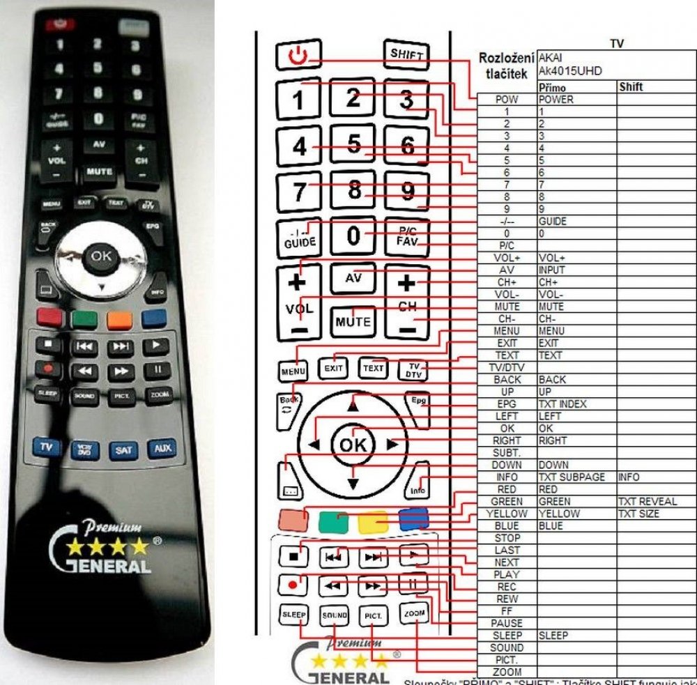 Náhradní dálkový ovladač AKAI AK4015UHD - 100procent náhrada 1:1 za originální dálkový ovladač. Dálkový ovladač je určen pro tyto modely AKAI: AK4015UHD. (Nemusí zde být uvedeny úplně všechny kompatibilní modely. Pokud si nejste jisti, sdělte nám svůj model (použijte online chat, e-mail, telefon), neprodleně zkontrolujeme a ověříme, zda je tento ovladač kompatibilní s Vaším přístrojem. Za poskytnutou informaci ručíme.) Ovladač je dodáván ve verzi značkového dálkového ovladače General Premium (zobrazen vlevo). Garantujeme Vám, že dostanete ovladač, který plně nahradí Váš původní originální ovladač a bude mít naprosto všechny funkce. Není to univerzální ovladač, ale ovladač, který je naprogramován a přímo určen pro modely přístrojů uvedené výše. Není třeba žádné párování, žádné kódy. Obdržíte od nás ovladač, který je připraven k použití - jediné, co musíte udělat, je vložit baterie a ovladač hned funguje. Podívejte se na obrázek ovladače a ujistěte se, že jsou v tabulce všechny funkce jako na původním originálním ovladači. Jedná se o plnohodnotný náhradní dálkový ovladač (není to „univerzál“). Má naprosto všechny funkce přesně jako originální ovladač. Záruční lhůta na ovladač je 2 roky. Dodáván také jednoduchý návod s mapováním funkcí. DOPLŇKOVÁ FUNKCE: Tento dálkový ovladač je možno naprogramovat na 1-4 zařízení (celkem tedy 4). Budete moci jedním ovladačem ovládat několik různých přístrojů jedním ovladačem. Pokud nám do komentáře v objednávce napíšete modely dalších přístrojů, naprogramujeme Vám ovladač na všechny. Za tuto doplňkovou službu bude naúčtován příplatek k ceně ovladače 50 Kč: více informací V případě, že v budoucnu vyměníte/obměníte Vaši domácí elektroniku, jsme schopni Vám tento ovladač přeprogramovat na naprosto jakékoliv nové/á zařízení. Ovladač General přežije Váš stávající přístroj!