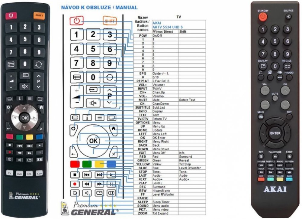 Náhradní dálkový ovladač AKAI AKTV5534 - 100% náhrada 1:1 za originální dálkový ovladač. Dálkový ovladač byl vyvinut speciálně na míru pro tyto modely značky AKAI:AKTV3224, AKTV3224T, AKTV4027, AKTV4028, AKTV5534, AKTV5534 UHD SMART, CTV4026T, CTV5584. (Nemusí zde být uvedeny úplně všechny kompatibilní modely. Pokud si nejste jisti, sdělte nám svůj model (použijte online chat, e-mail, telefon), neprodleně zkontrolujeme a ověříme, zda je tento ovladač kompatibilní s Vaším přístrojem. Za poskytnutou informaci ručíme.) Ovladač je dodáván ve verzi značkového dálkového ovladače General Premium (zobrazen vlevo). Garantujeme Vám, že dostanete ovladač, který plně nahradí Váš původní originální ovladač a bude mít naprosto všechny funkce stejné.Není to univerzální ovladač, ale ovladač, který je naprogramován a přímo určen pro modely přístrojů uvedené výše. Není třeba žádné párování, žádné kódy. Obdržíte od nás ovladač, který je připraven k použití - jediné, co musíte udělat, je vložit baterie a ovladač hned funguje. Podívejte se na obrázek ovladače a ujistěte se, že jsou v tabulce všechny funkce jako na původním originálním ovladači. Jedná se o plnohodnotný náhradní dálkový ovladač (není to „univerzál“). Má naprosto všechny funkce přesně jako originální ovladač. Záruční lhůta na ovladač je 3 roky. Dodáván také jednoduchý návod s mapováním funkcí. DOPLŇKOVÁ FUNKCE: Tento dálkový ovladač je možno naprogramovat na 1-4 zařízení (celkem tedy 4). Budete moci jedním ovladačem ovládat několik různých přístrojů jedním ovladačem. Pokud nám do komentáře v objednávce napíšete modely dalších přístrojů, naprogramujeme Vám ovladač na všechny. Za tuto doplňkovou službu bude naúčtován příplatek k ceně ovladače 50 Kč: více informacíV případě, že v budoucnu vyměníte/obměníte Vaši domácí elektroniku, jsme schopni Vám tento ovladač přeprogramovat na naprosto jakékoliv nové/á zařízení. Ovladač General přežije Váš stávající přístroj!