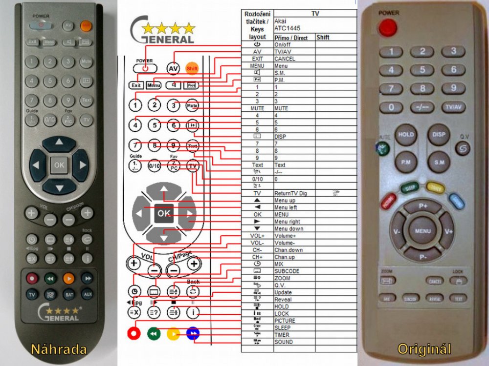 Náhradní dálkový ovladač AKAI ATC-1445 (ATC1445) - 100% náhrada 1:1 za originální dálkový ovladač. Dálkový ovladač byl vyvinut speciálně na míru pro tyto modely značky AKAI:ATC-1445, ATC-2175RF, CT-V216MT-E10, CT-V21NTF-PF-E10, CT-V29NTF-PF-E10. (Nemusí zde být uvedeny úplně všechny kompatibilní modely. Pokud si nejste jisti, sdělte nám svůj model (použijte online chat, e-mail, telefon), neprodleně zkontrolujeme a ověříme, zda je tento ovladač kompatibilní s Vaším přístrojem. Za poskytnutou informaci ručíme.) Ovladač je dodáván ve verzi značkového dálkového ovladače General Premium (zobrazen vlevo). Garantujeme Vám, že dostanete ovladač, který plně nahradí Váš původní originální ovladač a bude mít naprosto všechny funkce stejné.Není to univerzální ovladač, ale ovladač, který je naprogramován a přímo určen pro modely přístrojů uvedené výše. Není třeba žádné párování, žádné kódy. Obdržíte od nás ovladač, který je připraven k použití - jediné, co musíte udělat, je vložit baterie a ovladač hned funguje. Podívejte se na obrázek ovladače a ujistěte se, že jsou v tabulce všechny funkce jako na původním originálním ovladači. Jedná se o plnohodnotný náhradní dálkový ovladač (není to „univerzál“). Má naprosto všechny funkce přesně jako originální ovladač. Záruční lhůta na ovladač je 3 roky. Dodáván také jednoduchý návod s mapováním funkcí. DOPLŇKOVÁ FUNKCE: Tento dálkový ovladač je možno naprogramovat na 1-4 zařízení (celkem tedy 4). Budete moci jedním ovladačem ovládat několik různých přístrojů jedním ovladačem. Pokud nám do komentáře v objednávce napíšete modely dalších přístrojů, naprogramujeme Vám ovladač na všechny. Za tuto doplňkovou službu bude naúčtován příplatek k ceně ovladače 50 Kč: více informacíV případě, že v budoucnu vyměníte/obměníte Vaši domácí elektroniku, jsme schopni Vám tento ovladač přeprogramovat na naprosto jakékoliv nové/á zařízení. Ovladač General přežije Váš stávající přístroj!