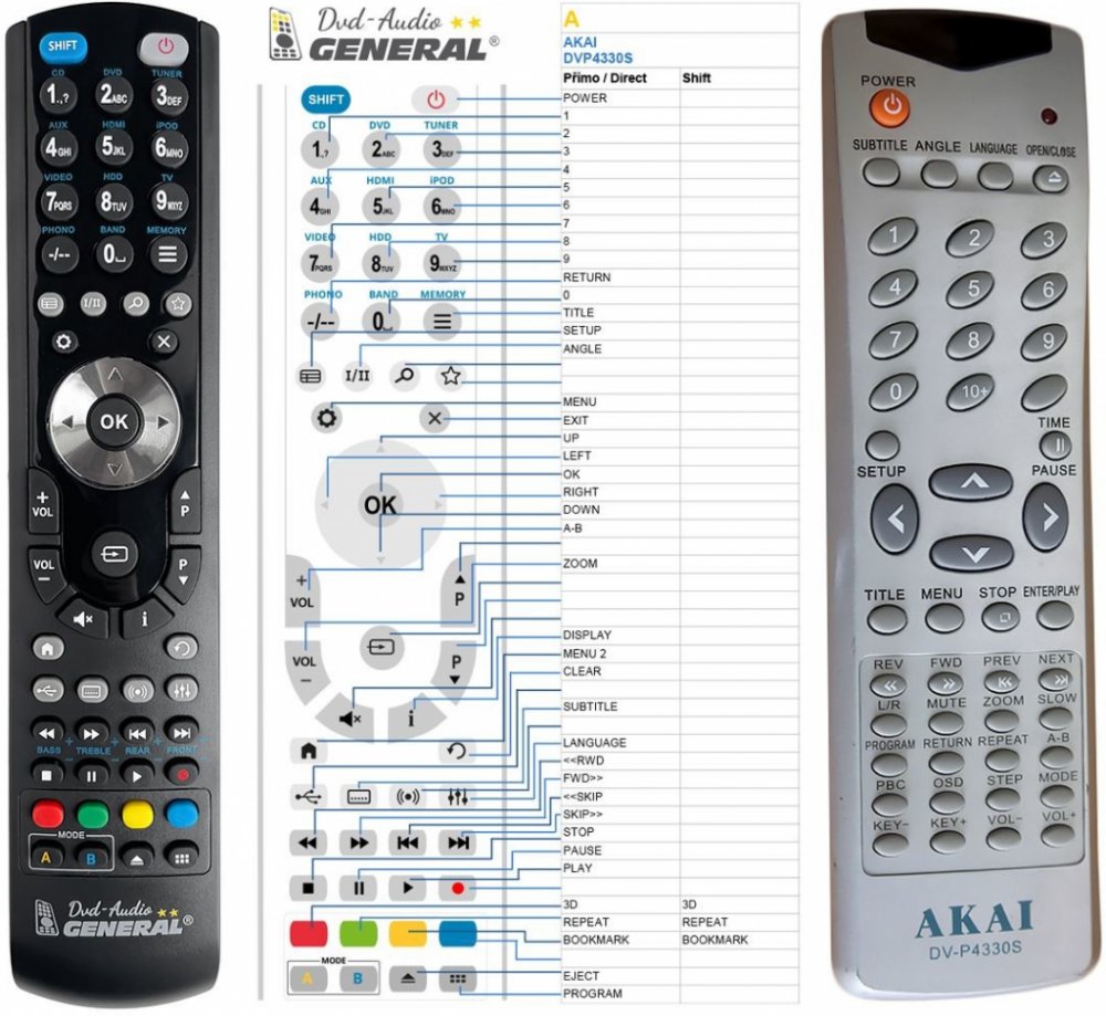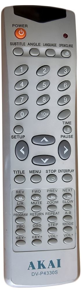 Náhradní dálkový ovladač AKAI DV-P4330S (DVP4330S) - 100% náhrada 1:1 za originální dálkový ovladač. Dálkový ovladač byl vyvinut speciálně na míru pro tyto modely značky AKAI:DV-P4330S, DVP4330S. (Nemusí zde být uvedeny úplně všechny kompatibilní modely. Pokud si nejste jisti, sdělte nám svůj model (použijte online chat, e-mail, telefon), neprodleně zkontrolujeme a ověříme, zda je tento ovladač kompatibilní s Vaším přístrojem. Za poskytnutou informaci ručíme.) Ovladač je dodáván ve verzi značkového dálkového ovladače General DVD/AUDIO (zobrazen vlevo). Garantujeme Vám, že dostanete ovladač, který plně nahradí Váš původní originální ovladač a bude mít naprosto všechny funkce stejné.Není to univerzální ovladač, ale ovladač, který je naprogramován a přímo určen pro modely přístrojů uvedené výše. Není třeba žádné párování, žádné kódy. Obdržíte od nás ovladač, který je připraven k použití - jediné, co musíte udělat, je vložit baterie a ovladač hned funguje. Podívejte se na obrázek ovladače a ujistěte se, že jsou v tabulce všechny funkce jako na původním originálním ovladači. Jedná se o plnohodnotný náhradní dálkový ovladač (není to „univerzál“). Má naprosto všechny funkce přesně jako originální ovladač. Záruční lhůta na ovladač je 3 roky. Dodáván také jednoduchý návod s mapováním funkcí. DOPLŇKOVÁ FUNKCE: Tento dálkový ovladač je možno naprogramovat na 1 další přístroj. Budete moci jedním ovladačem ovládat oba přístroje (např. DVD+TV nebo SOUNDBAR+TV apod.). Pokud nám do komentáře v objednávce napíšete model dalšího přístroje, naprogramujeme Vám ovladač na oba. Za tuto doplňkovou službu bude naúčtován příplatek k ceně ovladače 50 Kč: více informací