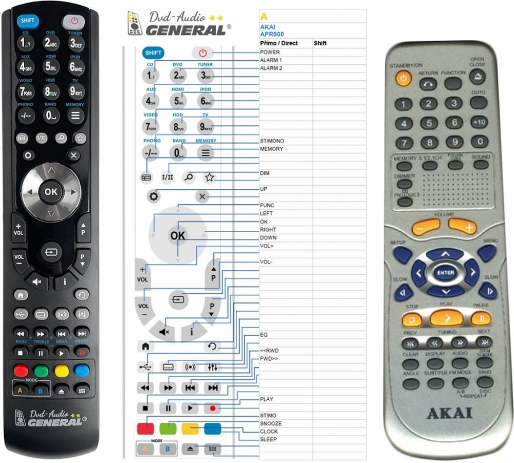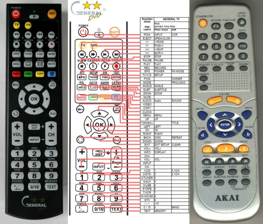 Náhradní dálkový ovladač AKAI DV-R3100SS, DV-R3110SS, DV-R3300SS, DV-R4000SS, DV-R4200SS, DV-R5000 (DVR3100SS, DVR3110SS, DVR3300SS, DVR4000SS, DVR4200SS, DVR5000) - 100% náhrada 1:1 za originální dálkový ovladač. Dálkový ovladač byl vyvinut speciálně na míru pro tyto modely značky AKAI:DV-R3100SS, DV-R3110SS, DV-R3300SS, DV-R4000SS, DV-R4200SS, DV-R5000, DVR3100SS, DVR3110SS, DVR3300SS, DVR4000SS, DVR4200SS, DVR5000. (Nemusí zde být uvedeny úplně všechny kompatibilní modely. Pokud si nejste jisti, sdělte nám svůj model (použijte online chat, e-mail, telefon), neprodleně zkontrolujeme a ověříme, zda je tento ovladač kompatibilní s Vaším přístrojem. Za poskytnutou informaci ručíme.) Ovladač je dodáván ve verzi značkového dálkového ovladače General DVD/AUDIO (zobrazen vlevo). Garantujeme Vám, že dostanete ovladač, který plně nahradí Váš původní originální ovladač a bude mít naprosto všechny funkce stejné.Není to univerzální ovladač, ale ovladač, který je naprogramován a přímo určen pro modely přístrojů uvedené výše. Není třeba žádné párování, žádné kódy. Obdržíte od nás ovladač, který je připraven k použití - jediné, co musíte udělat, je vložit baterie a ovladač hned funguje. Podívejte se na obrázek ovladače a ujistěte se, že jsou v tabulce všechny funkce jako na původním originálním ovladači. Jedná se o plnohodnotný náhradní dálkový ovladač (není to „univerzál“). Má naprosto všechny funkce přesně jako originální ovladač. Záruční lhůta na ovladač je 3 roky. Dodáván také jednoduchý návod s mapováním funkcí. DOPLŇKOVÁ FUNKCE: Tento dálkový ovladač je možno naprogramovat na 1 další přístroj. Budete moci jedním ovladačem ovládat oba přístroje (např. DVD+TV nebo SOUNDBAR+TV apod.). Pokud nám do komentáře v objednávce napíšete model dalšího přístroje, naprogramujeme Vám ovladač na oba. Za tuto doplňkovou službu bude naúčtován příplatek k ceně ovladače 50 Kč: více informací