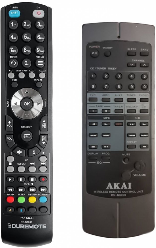 Dálkový ovladač AKAI RC-S3000 (RCS3000) duplikát 1:1 originálního dálkového ovladače. Dokonalá 1:1 kopie navržená a vyrobená naší firmou – má všechny funkce originálního ovladače pro tyto modely značky AKAI:AM-3000, AM3000, RCS3000. (Nemusí zde být uvedeny úplně všechny kompatibilní modely. Pokud si nejste jisti, sdělte nám svůj model (použijte online chat, e-mail, telefon), neprodleně zkontrolujeme a ověříme, zda je tento ovladač kompatibilní s Vaším přístrojem. Za poskytnutou informaci ručíme.) Dálkový ovladač General Duremote má naprosto všechny funkce a popisky tlačítek stejné jako originální dálkový ovladač. Není třeba nic nastavovat, žádné kódy, funguje ihned po vložení baterií se všemi výše uvedenými modely.Ovladač je dodáván ve verzi značkového dálkového ovladače General Duremote (zobrazen vlevo)Jedná se o ovladač vyrobený pro specifické zařízení – NENÍ to univerzální ovladač!Má naprosto všechny funkce jako originální dálkový ovladač.Má stejné popisky tlačítek, jako jste byli zvyklí z originálu.Popisky tlačítek jsou velmi odolné a nejdou seškrábat ani hrubou silou.3 roky záruka.Nulová poruchovost tohoto modelu! Nemáme zádné reklamace a přitom je to náš nejprodávanější ovladač.General Duremote byl tlačítko po tlačítku navržen a vyroben přesně podle originálního dálkového ovladače na obrázku vpravo. Výroben v naší firmě v Ostravě, vývoj, výroba i atesty v České republice - splňuje CE a ROHS standardy.SNADNÉ INTUITIVNÍ POUŽÍVÁNÍ: Na rozdíl od běžných náhradních ovladačů, General Duremote má 100% stejné popisky tlačítek jako Váš původní originální dálkový ovladač.Srovnání: Ostatní univerzální nebo programovatelné náhrady mají (kvůli úspoře nákladů) univerzální rozložení s nesprávně označenými tlačítky, a proto potřebují návod (tabulku funkcí), který říká, jaká je skutečná funkce jednotlivých tlačítek. To může způsobovat zmatek a nutnost neustálého vracení se k návodu je pro koncového uživatele obtěžující. Naopak při používání našeho dálkového ovladače General Duremote nahlížet do ..