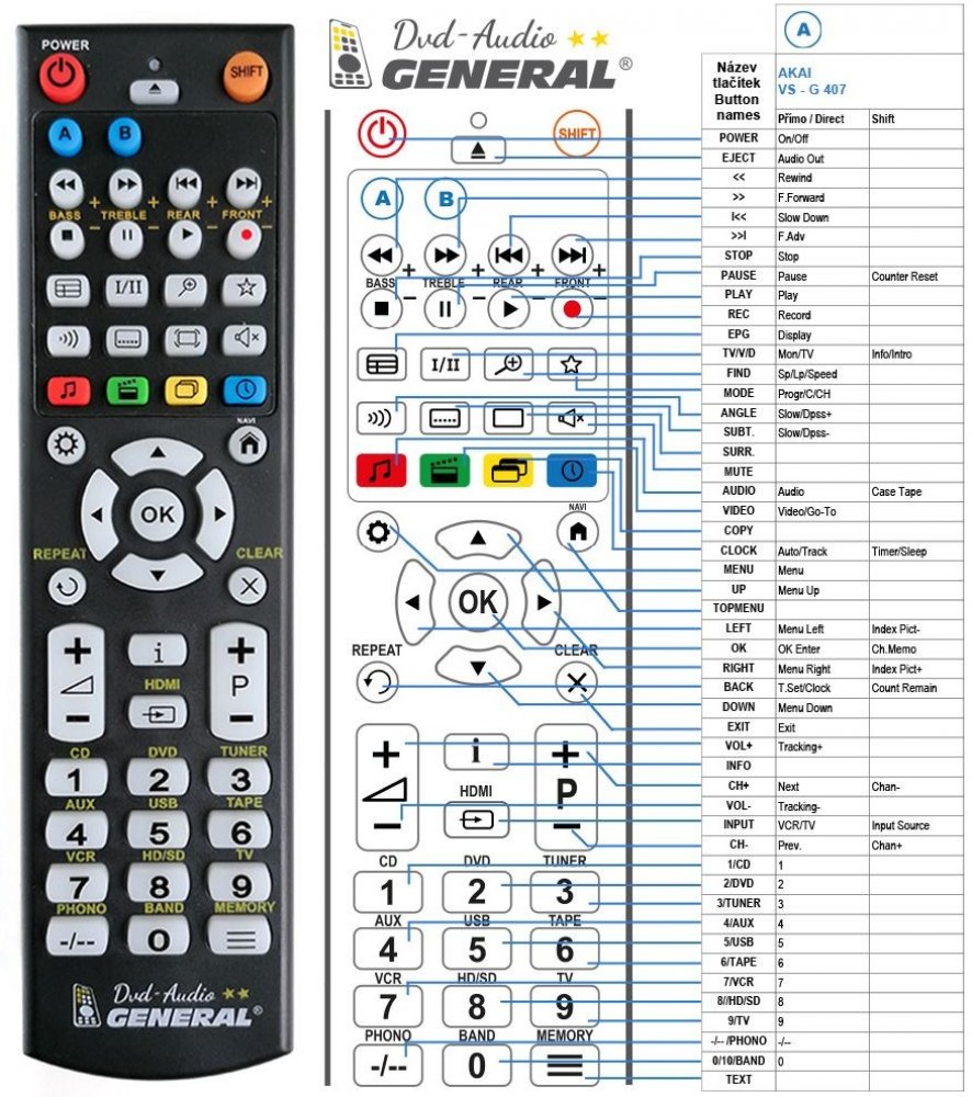 Náhradní dálkový ovladač AKAI VS-G 407 (VSG 407 ) - 100procent náhrada 1:1 za originální dálkový ovladač. Dálkový ovladač je určen pro tyto modely AKAI: VS-305, VS-35, VS-40, VS-G220, VS-G221, VS-G225, VS-G228, VS-G23, VS-G230, VS-G24, VS-G241, VS-G242, VS-G245, VS-G25, VS-G255, VS-G260, VS-G265., VS-G267, VS-G27, VS-G270, VS-G271, VS-G275., VS-G276, VS-G277, VS-G281, VS-G286, VS-G291, VS-G295, VS-G296, VS-G297, VS-G30, VS-G311, VS-G315, VS-G317, VS-G32, VS-G34, VS-G37, VS-G407, VS-G411, VS-G415, VS-G417, VS-G42, VS-G420, VS-G425, VS-G428., VS-G43, VS-G435. (Nemusí zde být uvedeny úplně všechny kompatibilní modely. Pokud si nejste jisti, sdělte nám svůj model (použijte online chat, e-mail, telefon), neprodleně zkontrolujeme a ověříme, zda je tento ovladač kompatibilní s Vaším přístrojem. Za poskytnutou informaci ručíme.) Ovladač je dodáván ve verzi značkového dálkového ovladače General DVD/AUDIO (zobrazen vlevo). Garantujeme Vám, že dostanete ovladač, který plně nahradí Váš původní originální ovladač a bude mít naprosto všechny funkce. Není to univerzální ovladač, ale ovladač, který je naprogramován a přímo určen pro modely přístrojů uvedené výše. Není třeba žádné párování, žádné kódy. Obdržíte od nás ovladač, který je připraven k použití - jediné, co musíte udělat, je vložit baterie a ovladač hned funguje. Podívejte se na obrázek ovladače a ujistěte se, že jsou v tabulce všechny funkce jako na původním originálním ovladači. Jedná se o plnohodnotný náhradní dálkový ovladač (není to „univerzál“). Má naprosto všechny funkce přesně jako originální ovladač. Záruční lhůta na ovladač je 2 roky. Dodáván také jednoduchý návod s mapováním funkcí. DOPLŇKOVÁ FUNKCE: Tento dálkový ovladač je možno naprogramovat na 1 další přístroj. Budete moci jedním ovladačem ovládat oba přístroje (např. DVD plus TV nebo SOUNDBAR plus TV apod.). Pokud nám do komentáře v objednávce napíšete model dalšího přístroje, naprogramujeme Vám ovladač na oba. Za tuto doplňkovou službu bude naúčtován příplatek k ceně ovladače 50 Kč: více informací