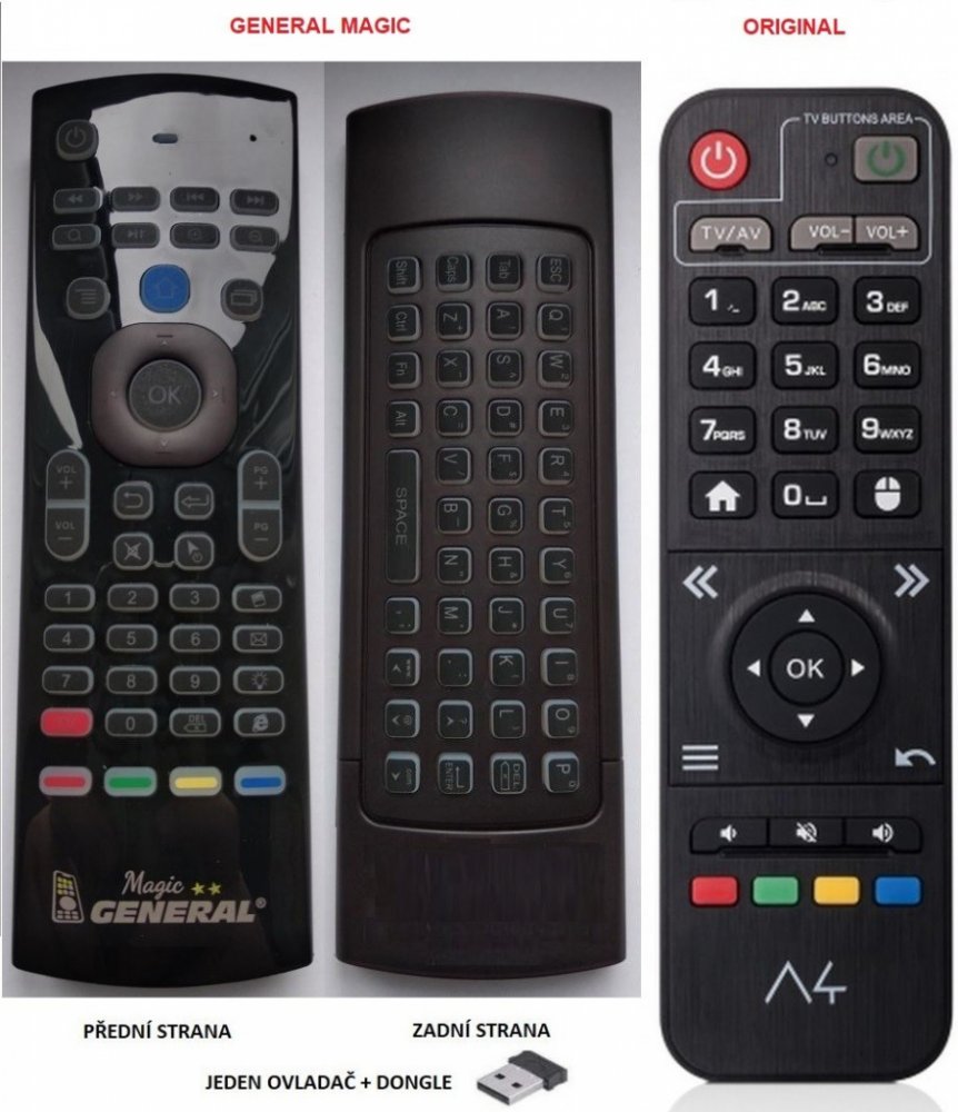 PLNOHODNOTNÁ náhrada magického dálkového ovladače AMIKO A4 OTT s integrovanou klávesnicí a možností nastavení na další přístroje.Dálkový ovladač byl vyvinut speciálně na míru pro tyto modely značky AMIKO:A4 OTT. (Nemusí zde být uvedeny úplně všechny kompatibilní modely. Pokud si nejste jisti, sdělte nám svůj model (použijte online chat, e-mail, telefon), neprodleně zkontrolujeme a ověříme, zda je tento ovladač kompatibilní s Vaším přístrojem. Za poskytnutou informaci ručíme.) Náhradní Ovladač je dodáván ve verzi luxusního multifunkčního air mouse ovladače s integrovanou klávesnicí General MAGIC (zobrazen vlevo). Ovladač dostanete již nakonfigurovaný na výše uvedené modely. Nevyžaduje žádné nastavování ani kódy.FUNKCE:2,4G rádiová technologie ovládání pohybem pomocí Gyroskopu (tzv. létající myš), RF bezdrátová klávesnice + IR dálkové ovládání s funkcí učení (3v1).SNADNÁ INSTALACE - PLUG & PLAY: Zasuňte USB adaptér do televizoru, počkejte několik sekund, dokud se na displeji neobjeví šipka a můžete hned začít používat. USB adaptér je součástí a je již spárován. Není třeba žádné další párování. Nevyžaduje od Vás žádné nastavování, ovladač Vám přijde již námi nakonfigurovaný na Vaši SMART TV. Vybalíte, vložíte baterie a ovládáte! Ale přesto nepřicházíte o možnost si nastavení ovladače General Magic sami upravovat podle Vašich potřeb (pokud se třeba budete u sledování TV nudit :-) General MAGIC se umí učit kódy z jakéhokoliv jiného IR ovladače DVD, HIFI, BLUE-RAY, AVR atd. Můžete si na ho naučit tak, že bude umět ovládat nejen Váš smart televizor, ale také všechny ostatní Vaše přístroje. Ovládání všeho jedním ovladače General SMART bude velmi snadné. General MAGIC funguje jako létající myš. Pomocí integrovaného gyroskopu umožňuje snadné ovládání pohybem ruky držící ovladač. Je to stejné jako by jste měli v ruce PC myš, která neleží na podložce, ale hýbete s ní v prostoru. Rychlost pohybu kurzoru na obrazovce lze nastavit. Klávesnice na zadní straně usnadní vyhledáv..