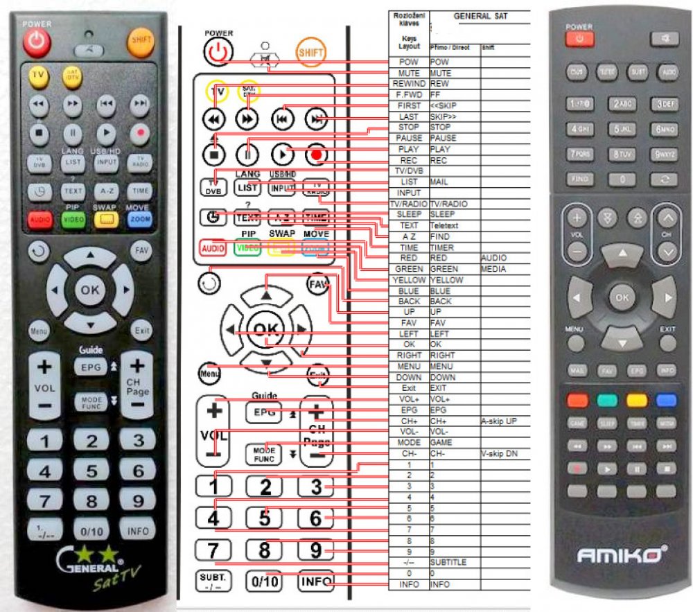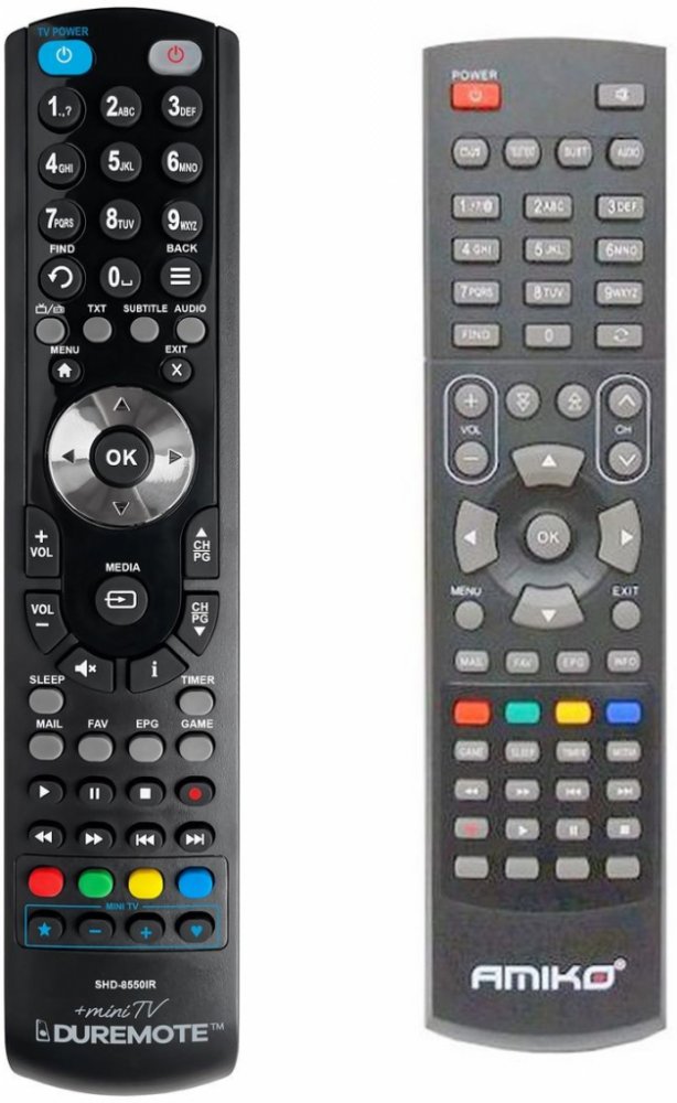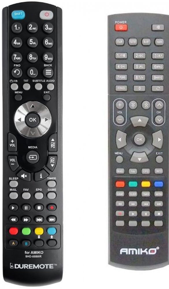 Náhradní dálkový ovladač AMIKO SHD-8550IR (SHD8550IR) - 100% náhrada 1:1 za originální dálkový ovladač. Dálkový ovladač je určen pro tyto modely AMIKO:SHD-8550IR, SHD8550IR. (Nemusí zde být uvedeny úplně všechny kompatibilní modely. Pokud si nejste jisti, sdělte nám svůj model (použijte online chat, e-mail, telefon), neprodleně zkontrolujeme a ověříme, zda je tento ovladač kompatibilní s Vaším přístrojem. Za poskytnutou informaci ručíme.) Ovladač je dodáván ve verzi značkového dálkového ovladače General SAT/TV (zobrazen vlevo). Garantujeme Vám, že dostanete ovladač, který plně nahradí Váš původní originální ovladač a bude mít naprosto všechny funkce stejné.Není to univerzální ovladač, ale ovladač, který je naprogramován a přímo určen pro modely přístrojů uvedené výše. Není třeba žádné párování, žádné kódy. Obdržíte od nás ovladač, který je připraven k použití - jediné, co musíte udělat, je vložit baterie a ovladač hned funguje. Podívejte se na obrázek ovladače a ujistěte se, že jsou v tabulce všechny funkce jako na původním originálním ovladači. Jedná se o plnohodnotný náhradní dálkový ovladač (není to „univerzál“). Má naprosto všechny funkce přesně jako originální ovladač. Záruční lhůta na ovladač je 3 roky. Dodáván také jednoduchý návod s mapováním funkcí. DOPLŇKOVÁ FUNKCE: Tento dálkový ovladač je možno naprogramovat na 1 další přístroj. Budete moci jedním ovladačem ovládat oba přístroje (např. SAT+TV nebo SAT+DVD apod). Pokud nám do komentáře v objednávce napíšete model dalšího přístroje, naprogramujeme Vám ovladač na oba. Za tuto doplňkovou službu bude naúčtován příplatek k ceně ovladače 50 Kč: více informací