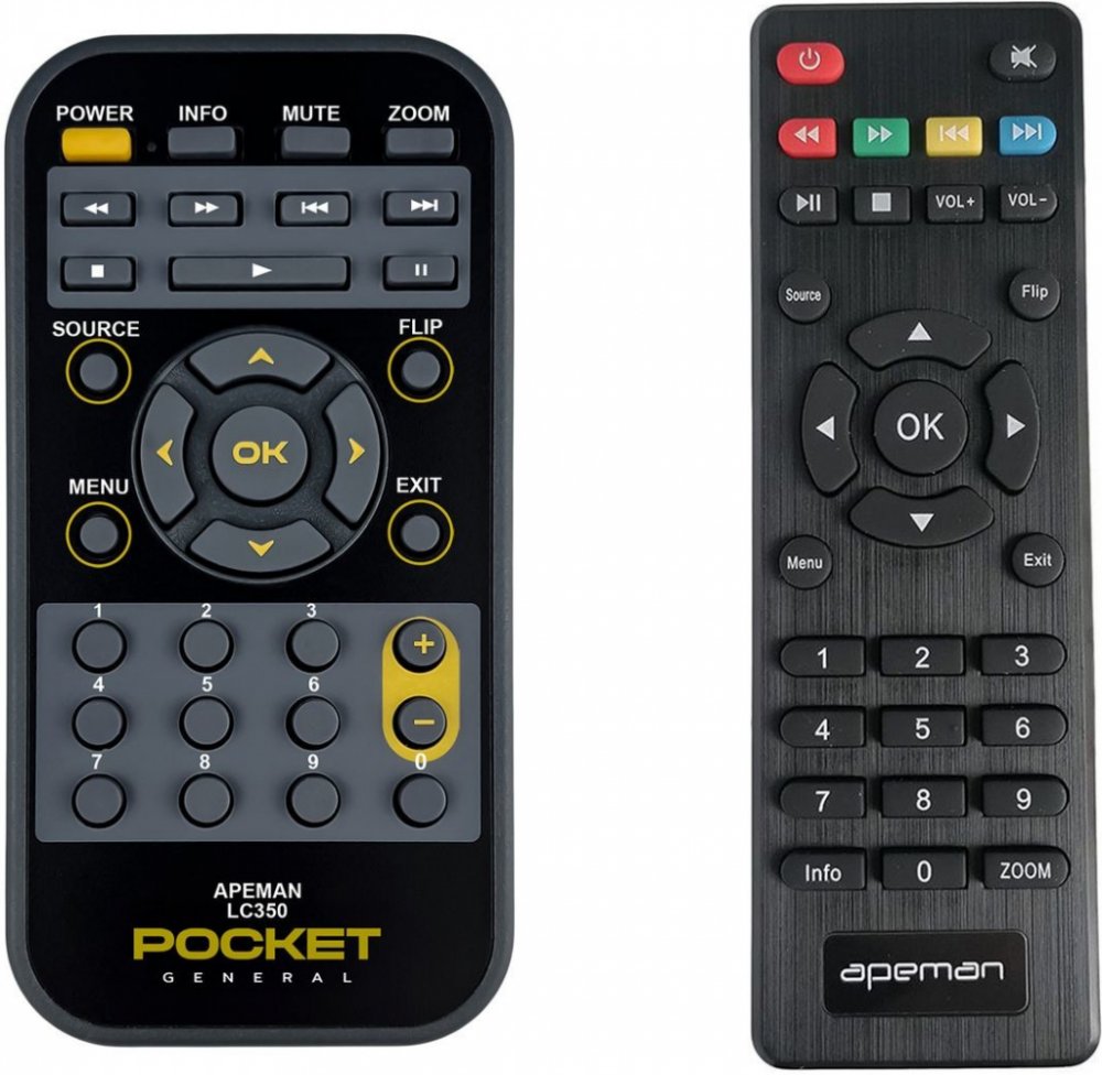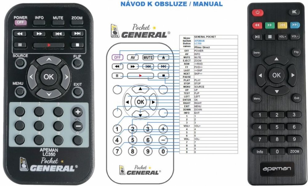 Dálkový ovladač APEMAN LC-350 (LC350) duplikát 1:1 originálního dálkového ovladače. Dálkový ovladač je určen pro tyto modely APEMAN: LC-350, LC350. (Nemusí zde být uvedeny úplně všechny kompatibilní modely. Pokud si nejste jisti, sdělte nám svůj model (použijte online chat, e-mail, telefon), neprodleně zkontrolujeme a ověříme, zda je tento ovladač kompatibilní s Vaším přístrojem. Za poskytnutou informaci ručíme.) Dálkový ovladač General POCKET duplikát má naprosto všechny funkce a popisky tlačítek stejné jako originální dálkový ovladač. Není třeba nic nastavovat, žádné kódy, funguje ihned po vložení baterií se všemi výše uvedenými modely. Ovladač je dodáván ve verzi značkového dálkového ovladače General POCKET duplikát (zobrazen vlevo) Jedná se o ovladač vyrobený pro specifické zařízení – NENÍ to univerzální ovladač! Má naprosto všechny funkce jako originální dálkový ovladač. Má stejné popisky tlačítek, jako jste byli zvyklí z originálu. Popisky tlačítek jsou velmi odolné a nejdou seškrábat ani hrubou silou. 2 roky záruka. General POCKET duplikát byl navržen a vyroben přesně podle originálního dálkového ovladače tlačítko po tlačítku. Ovladač je vyvinut a testován v České republice a podléhá CE a ROHS standardům. SNADNÉ INTUITIVNÍ POUŽÍVÁNÍ: Na rozdíl od běžných náhradních ovladačů, General POCKET duplikát má 100procent odpovídající popisky tlačítek jako na originálním ovladači. Srovnání: Jiné univerzální nebo programovatelné náhrady mají kvůli snížení nákladů názvy/popisky a rozložení tlačítek univerzální, popisky tlačítek často neodpovídají funkci tlačítka a vyžadují tedy návody k použití. To často vede k nejasnostem, co které tlačítko dělá a stálá potřeba manuálu je velmi obtěžující. S ovladačem General POCKET duplikát žádný návod nepotřebujete, tlačítko dělá přesně to, co symbolizuje jeho popisek. GARANTUJEME 100procent FUNKČNOST: Narozdíl od jiných náhrad je každý dálkový ovladač General POCKET duplikát přímo v naší firmě navržen a testován na míru pro konkrétní zařízení tak, aby každé tlačítko odpovídalo funkci tlačítka originálního ovladače. Díky tomu můžeme zaručit 100procent funkčnost přesně jako originální ovladač. Samotné šasi bylo navrženo a vyvíjeno tak, aby bylo co nejodolnější a nejspolehlivější. Zároveň však byl kladen důraz na přívětivé rozložení tlačítek a popisky tlačítek jsou optimalizovány pro dobrou viditelnost. Materiály a součástky byly podrobeny důkladným testům, aby odolaly i tomu nejtvrdšímu zacházení a poskytovaly tak dlouhodobou životnost. Názvy tlačítek jsou na ovladači natištěny moderní technologií v naší firmě (naše vlastní know-how). Tisk je extrémně odolný a nelze jej setřít ani oškrábat. DUPLIKÁT originálního dálkového ovladače má naprosto stejné funkce a stejné názvy tlačítek jako Váš původní originální ovladač. Nemusíte nic nastavovat, po vložení baterií bude okamžitě fungovat, ovladač je již nakonfigurován tak, aby fungoval na modely uvedené výše. Nápisy na tlačítkách přesně odpovídají funkcím tlačítek, tiskneme je přesně podle originálního ovladače. Narozdíl od všech univerzálních a programovatelných náhrad, kde jsou názvy tlačítek univerzální a pro uživatele matoucí. Popisky jsou natištěny technicky vyspělou technologií v naší provozovně (naše know-how), jsou extrémně odolné, nejdou setřít ani seškrábat (např. nehtem). Opravdu jsme schopni vyrobit jakýkoliv dálkový ovladač! Splníme i požadavky na exotické ovladače, které nejsou (zatím) v naší nabídce. DUPLIKÁT = Nejlepší poměr cena/výkon. DOPORUČUJEME! DUPLIKÁT originálního dálkového ovladače má naprosto stejné funkce a stejné názvy tlačítek jako Váš původní originální ovladač. Nemusíte nic nastavovat, po vložení baterií bude okamžitě fungovat, ovladač je již nakonfigurován tak, aby fungoval na modely uvedené níže. Nápisy na tlacitkach přesně odpovídají funkcím tlačítek, tiskneme je přesně podle oriignálního ovladače. Narozdil od všech univerzalnich a programovatelnych náhrad, kde jsou názvy tlačítek univerzální a pro uživatele matoucí. Popisky jsou natištěny technicky vyspělou technologií v naší provozovně (naše know-how), jsou extrémně odolné, nejdou setřít ani seškrábat (např.nehtem). Opravdu jsme schopni vyrobit jakýkoliv dálkový ovladač! Splníme i požadavky na exotické ovladače, které nejsou (zatím :) v naší nabídce. DUPLIKÁT = Nejlepší poměr cena/výkon. DOPORUČUJEME!