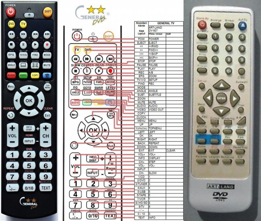 Náhradní dálkový ovladač ART-LAND DV-927 (DV927) - 100procent náhrada 1:1 za originální dálkový ovladač. Dálkový ovladač je určen pro tyto modely ART-LAND: DV-927, DV927, DVD-927, DVD927. (Nemusí zde být uvedeny úplně všechny kompatibilní modely. Pokud si nejste jisti, sdělte nám svůj model (použijte online chat, e-mail, telefon), neprodleně zkontrolujeme a ověříme, zda je tento ovladač kompatibilní s Vaším přístrojem. Za poskytnutou informaci ručíme.) Ovladač je dodáván ve verzi značkového dálkového ovladače General DVD/AUDIO (zobrazen vlevo). Garantujeme Vám, že dostanete ovladač, který plně nahradí Váš původní originální ovladač a bude mít naprosto všechny funkce. Není to univerzální ovladač, ale ovladač, který je naprogramován a přímo určen pro modely přístrojů uvedené výše. Není třeba žádné párování, žádné kódy. Obdržíte od nás ovladač, který je připraven k použití - jediné, co musíte udělat, je vložit baterie a ovladač hned funguje. Podívejte se na obrázek ovladače a ujistěte se, že jsou v tabulce všechny funkce jako na původním originálním ovladači. Jedná se o plnohodnotný náhradní dálkový ovladač (není to „univerzál“). Má naprosto všechny funkce přesně jako originální ovladač. Záruční lhůta na ovladač je 2 roky. Dodáván také jednoduchý návod s mapováním funkcí. DOPLŇKOVÁ FUNKCE: Tento dálkový ovladač je možno naprogramovat na 1 další přístroj. Budete moci jedním ovladačem ovládat oba přístroje (např. DVD plus TV nebo SOUNDBAR plus TV apod.). Pokud nám do komentáře v objednávce napíšete model dalšího přístroje, naprogramujeme Vám ovladač na oba. Za tuto doplňkovou službu bude naúčtován příplatek k ceně ovladače 50 Kč: více informací